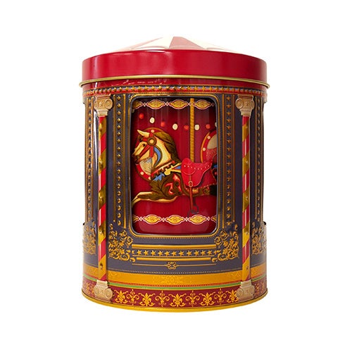 英国生まれのカルーセルブリキオルゴール缶。音楽に合わせてメリーゴーランドのように絵柄が回転し、クリスマス気分を盛り上げるアイテム。中には国産ビスケットが入っています。