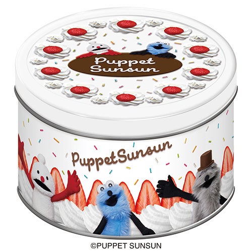 話題のキャラクター「パペットスンスン」のクッキー缶。ホールケーキのような可愛らしいデザイン。キャラクター好きな方へのギフトとしてもおすすめです。
