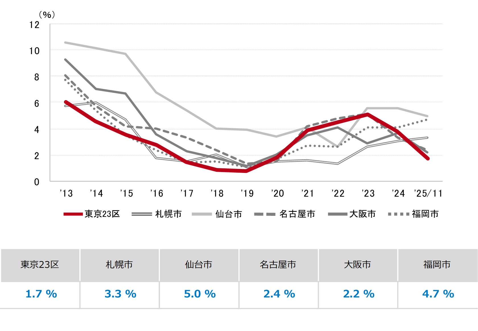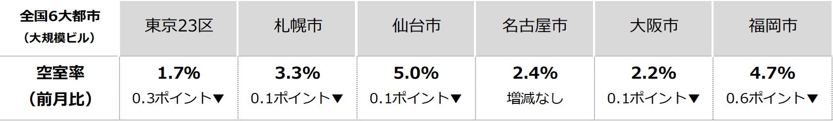 三幸エステート株式会社(本社:東京都中央区、取締役社長:福島正二郎)は、2025年11月度の東京都心5区(千代田区、中央区、港区、新宿区、渋谷区)および全国6大都市(東京、札幌、仙台、名古屋、大阪、福岡)の大規模ビル※1のマーケットデータをまとめた「オフィスマーケット2025年12月号」を公表します。