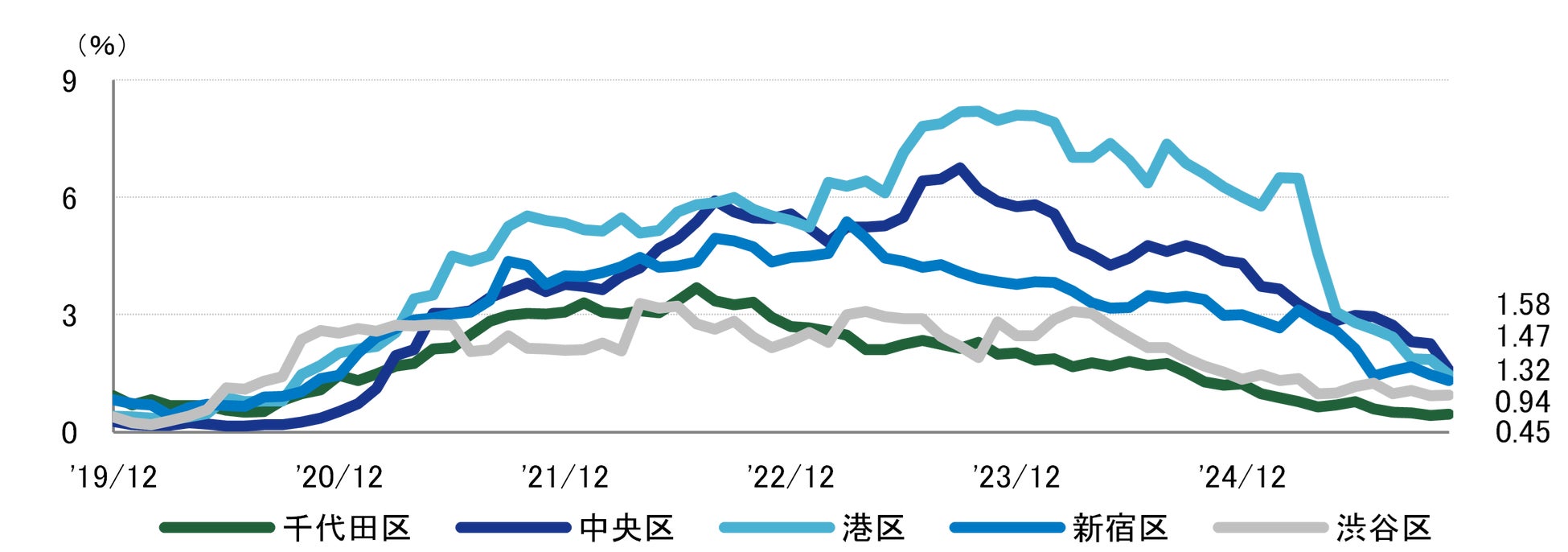 区別の空室率は、中央区が前月比マイナス0.68ポイントの1.58%と大幅な低下で、2021年3月以来の1%台となった。千代田区は11ヵ月連続、渋谷区は2ヵ月連続で1%を下回り、コロナ禍前と同様の極めて低い水準で推移している。