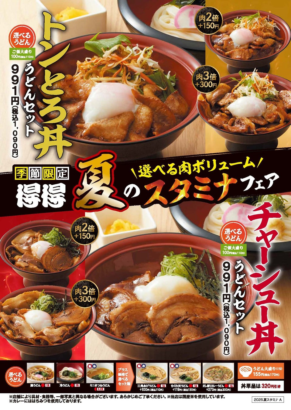 株式会社家族亭(本社・大阪府大阪市、代表取締役社長・坪山 憲司)が運営するうどんチェーン「得得(とくとく)」は、2025年7月1日(火)~8月31日(日)の期間、得得では、この夏限定の『夏のスタミナフェア』を開催いたします。主役は、ジューシーな「トンとろ」と旨味たっぷりの「チャーシュー」をぜいたくに使ったスタミナ満点の特製丼。さらに、お肉の量は通常の2倍・3倍も選べるボリュームアップ仕様!お腹の空き具合や気分に合わせて自由にカスタマイズいただけます。今年も猛暑が予想されますが、そんな時こそ得得のおいしいうどんとお肉で暑い夏を乗り切りましょう!