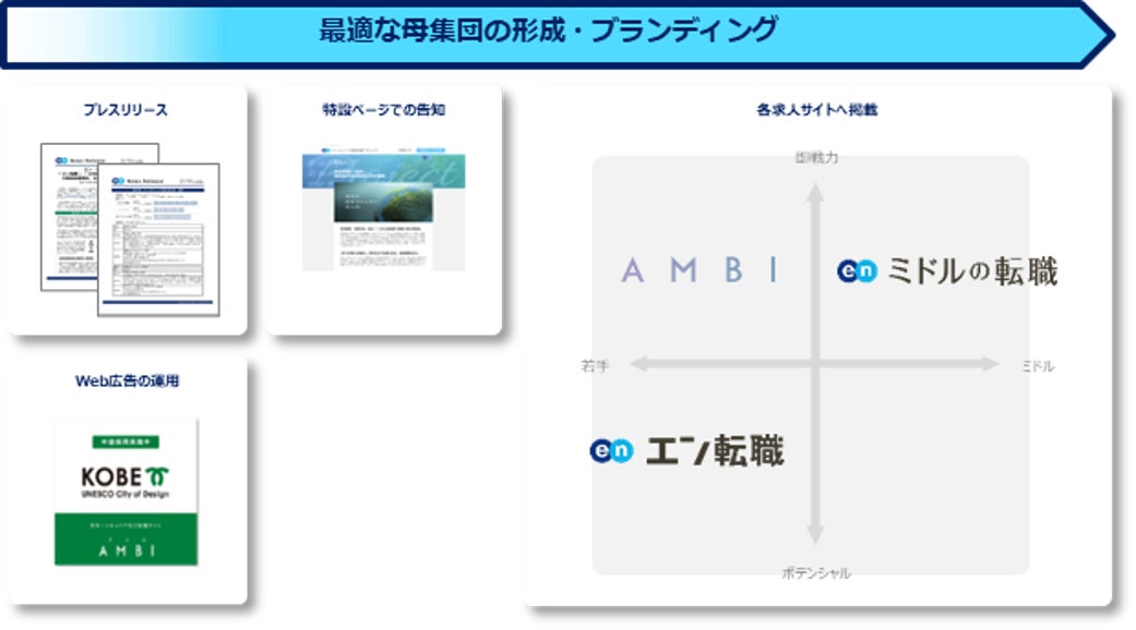 プレスリリースや特設ページ、採用HPの作成、Web広告を用いた告知に加え、各求人サイトでの集客サポートを実施いたします。『エン転職』『AMBI』『ミドルの転職』とターゲットの異なる3つの求人サイトを活用することで、ターゲットへ網羅的に求人を届けます。