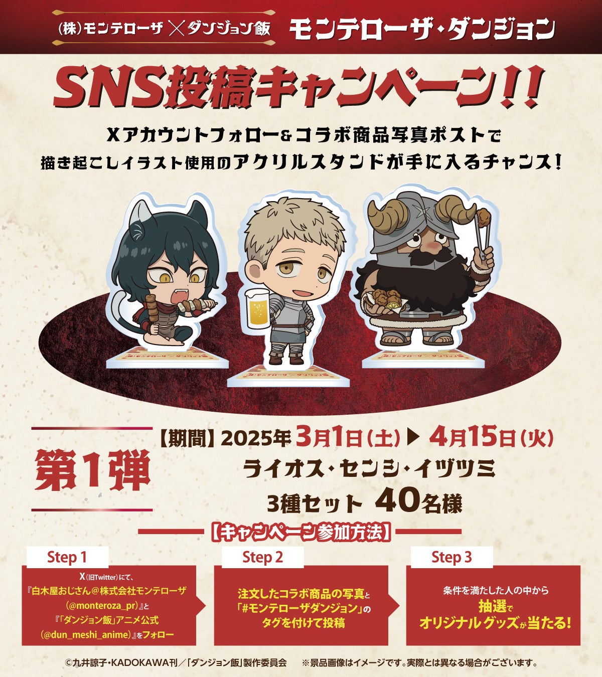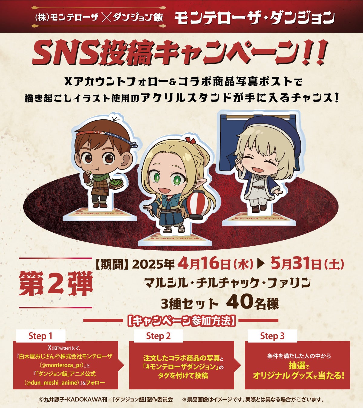 また、X(旧Twitter)で、『白木屋おじさん@株式会社モンテローザ』 と 『「ダンジョン飯」アニメ公式』の両方のアカウントをフォローし、注文した“コラボメニュー”の写真と「#モンテローザダンジョン」のタグをつけて投稿していただくと、抽選で合計100名様に「モンテローザ・ダンジョン」のオリジナルグッズ(アクリルスタンドセット、メガジョッキ)が当たるSNS投稿キャンペーンも開催しますので、この機会に是非、お近くの当社店舗をご利用ください。