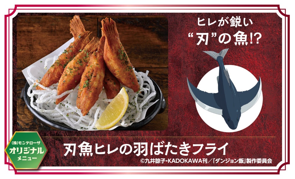 株式会社モンテローザが運営する対象ブランド(白木屋・笑笑・魚民・千年の宴・目利きの銀次・山内農場など)で、TVアニメ「ダンジョン飯」に登場するモンスター食材の魔物食レシピを再現したコラボメニューを販売します。コラボメニューをご注文のお客様に、オリジナルクリアカードを1品につき1枚プレゼント(※2)します。