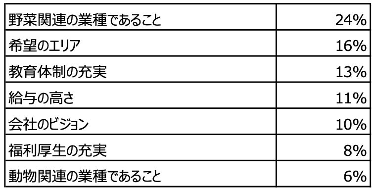 さらに、「前向きに検討できる」「妥協して検討できる」と回答した方に対して、どのような要素があると検討できるか、最優先順位の高いものを聞いたところ、最も多かったのは「野菜関連の業種であること」(24%)、次に「希望のエリア」(16%)、「教育体制の充実」(13%)と続く結果になりました。