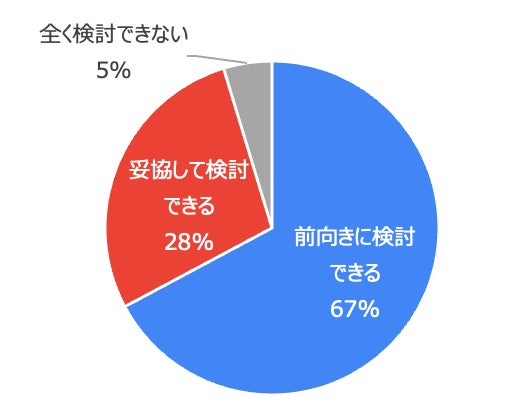 続いて、一番に選んだ業種以外に他業種も検討できるか聞いたところ、「前向きに検討できる」(67%)、「妥協して検討できる」(28%)という結果になりました。95%の登録者が他業種でも検討しているということになります。