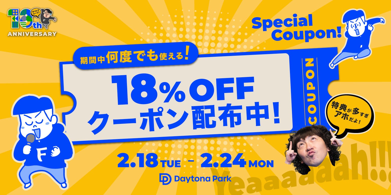 株式会社デイトナ・インターナショナルの公式オンラインストア「Daytona Park(デイトナパーク)」は2025年2月で18周年を迎えます。このたび、18周年の感謝と喜びを込めて18にちなんだ『Yeah!』をテーマに2025年2月18日(火)から3月9日(日)にかけて18周年アニバーサリーキャンペーンを開催いたします。期間中はオンラインストアにてさまざまな特典やイベントをご用意しております。