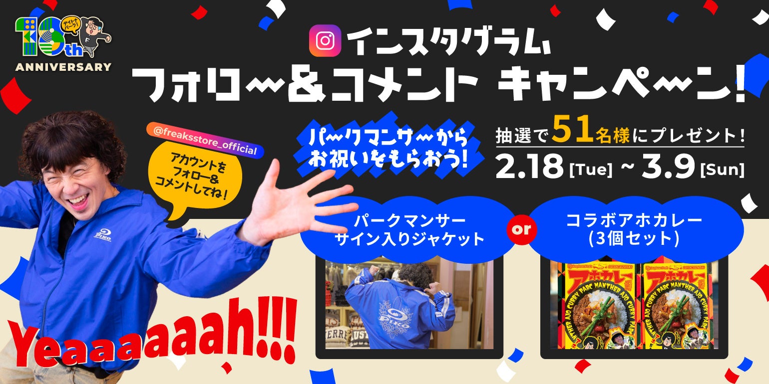 パークマンサーさんからDaytona Park18周年のお祝いとしてみなさまへ特別なギフトが。Instagramフォロー&コメントキャンペーンにてプレゼントします。 FREAK‘S STORE 公式アカウント(@freaksstore_official)をフォロー&キャンペーン投稿にコメントで抽選で51名様に豪華アイテムプレゼント!