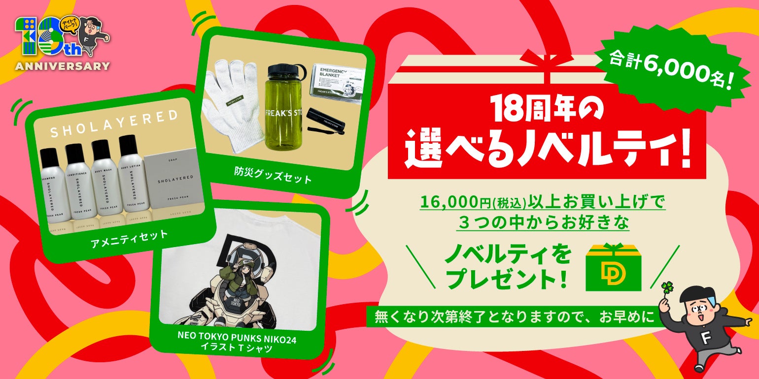 18周年を記念して、16,000円(税込)以上お買い上げの先着6,000名様に、3つの中からお好きなノベルティをプレゼント!※無くなり次第終了となります。