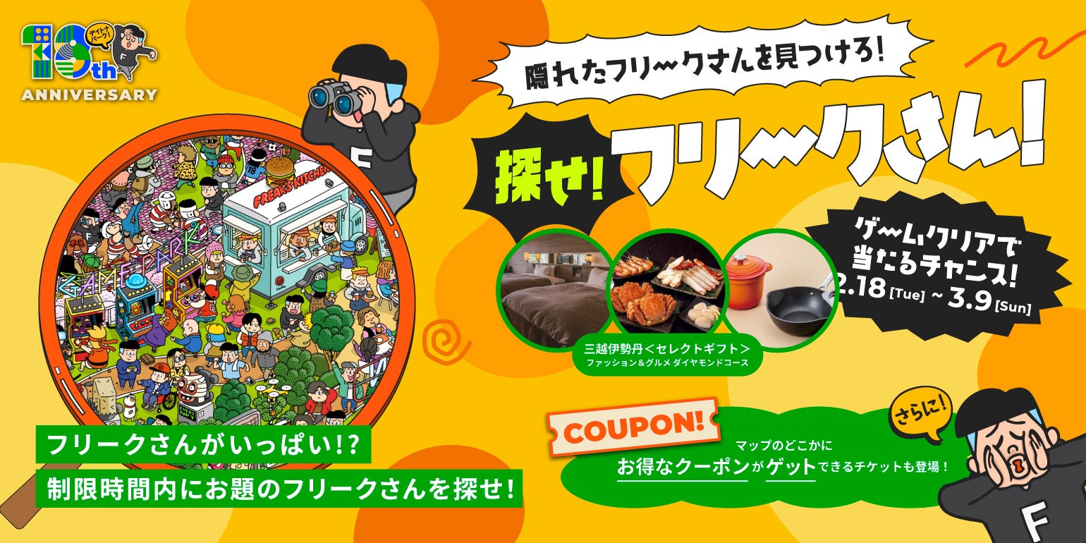デイトナパークにフリークさんがいっぱい!?制限時間内にお題のフリークさんを探せ!ゲームクリアで豪華賞品が当たるチャンス!さらにキャンペーン期間中は、マップのどこかにお得なクーポンがゲットできるチケットも登場!探してみよう!