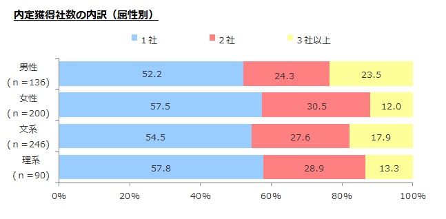 男女別では、複数内定獲得者の割合は、男性で47.8%に上り、女性の42.5%よりも高い。文理別では、複数内定獲得者の割合は、文系で45.5%に上り、理系の42.2%よりも高い。