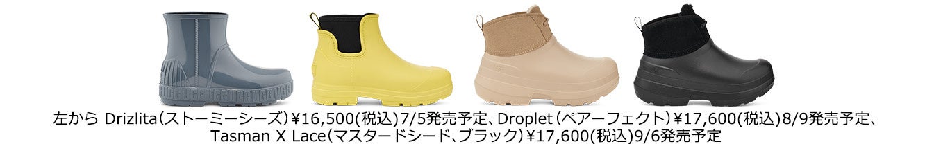 フォーム成型シューズの快適さとやわらかなUGGplush™ブレンドのライナーとソックライナーを組み合わせたTasman X Lace(タスマンXレース)も新登場。レースアップのデザインと約4.4cmのヒールでエレガントなルックスを叶えつつ、防水スエードとEVA素材のアッパー、独自のクッション性の高いアウトソールで、軽い履き心地。TPE素材の一体成型のアッパーはサイドゴアのハイブリッド構造で、少し細めのデザインが雨の日以外でもカジュアルブーツとして履けるDroplet(ドロップレット)やUGGのクラシックブーツとフラッフサンダルFluffita(フラッフィータ)のデザインを融合した防水仕様の Drizlita(ドリズリータ)にも新色が登場。