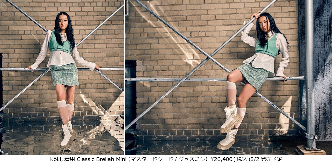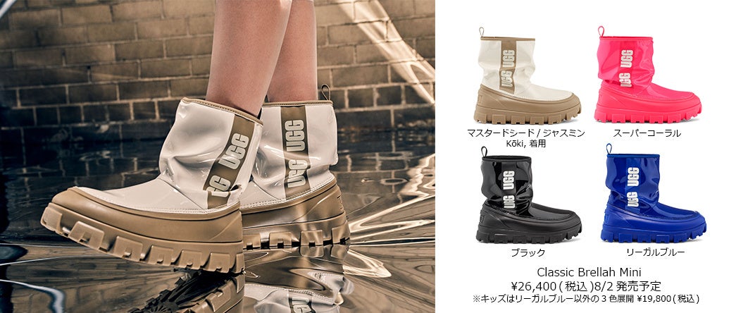 Feels Like UGGキャンペーンで紹介する新コレクションでKōki,が着用するのは、7月1日発売のスリッパとサンダルのハイブリッド ファーサンダルFoamO UGGplush™ Slide(フォームオー UGGプラッシュ™ スライド)と、防水素材をクシュッとさせたデザインが新しい晴雨兼用ブーツClassic Brellah Mini(クラシック ブレラ ミニ)。FoamO UGGplush™ Slideは、やわらかなリサイクルポリエステルのアッパーと贅沢なUGGplush™(アップサイクルウールとユーカリを原料とした再生繊維テンセル™リヨセル混合)素材のフットベッドに、成長の早い再生可能なサトウキビ由来のEVA素材でつくられた成型フォームのアウトソールで、弾むような履き心地。ビーチや庭履きなどアウトドアシーンに最適です。UGGのクラシックミニブーツに洗練されたモダンなアレンジを加えたClassic Brellah Miniは、大胆な合成パテントアッパーのサイドにUGGロゴを施したデザインと頑丈なプラットフォームTPEアウトソールが特徴。キッズサイズもあるから親子でのリンクコーデも楽しめたり、雨の日も晴れの日も履けてコーデの幅を広げてくれるアイテムです。