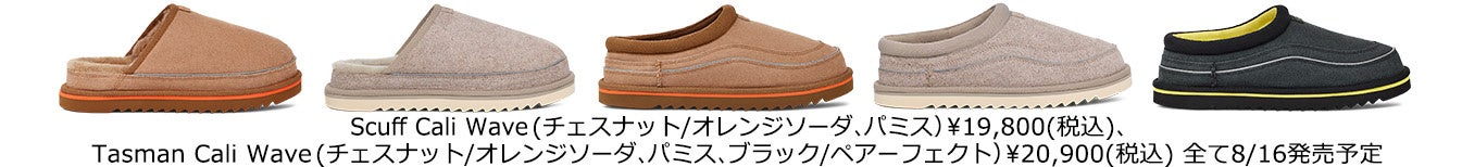 キャンペーンで登場するコレクションには、8月16日発売予定のTasman Cali Wave (タスマン カリ ウェーブ)も。クラシックなタスマンに新たなイノベーションを加えたTasman Cali Waveは、リサイクルされた革の端切れとポリエステル繊維をブレンドしたエコスエードで作られています。リサイクルされたポリ繊維から作られた上品なリフレクターのアンダーレイと、UGGplush™アップサイクルウールブレンドのライニングの心地よさが特徴。アウトソールも、石油由来のEVAではなく、雨水で育った再生可能なサトウキビから作られています。UGGファンに人気のスリッパに、プラットフォームとレーシングストライプが取り入れられたScuff Cali Wave (スカッフ カリ ウェーブ)も新登場。