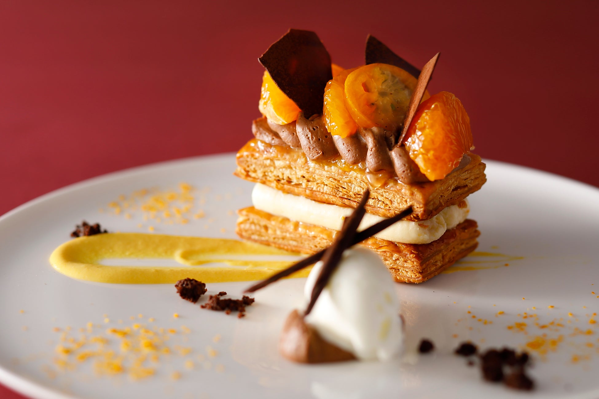 上質なバターを折込んだパイ生地で、金柑のペーストを練り込んだ爽やかな風味のカスタードクリームをサンドしました。 金柑のコンポートとマルムラード、ショコラのクリームをアクセントに重ね、程よい酸味と甘さが特長の温州みかんを飾った一皿です。ヨーグルトソルベのさっぱりした味わいが柑橘を引き立てます。