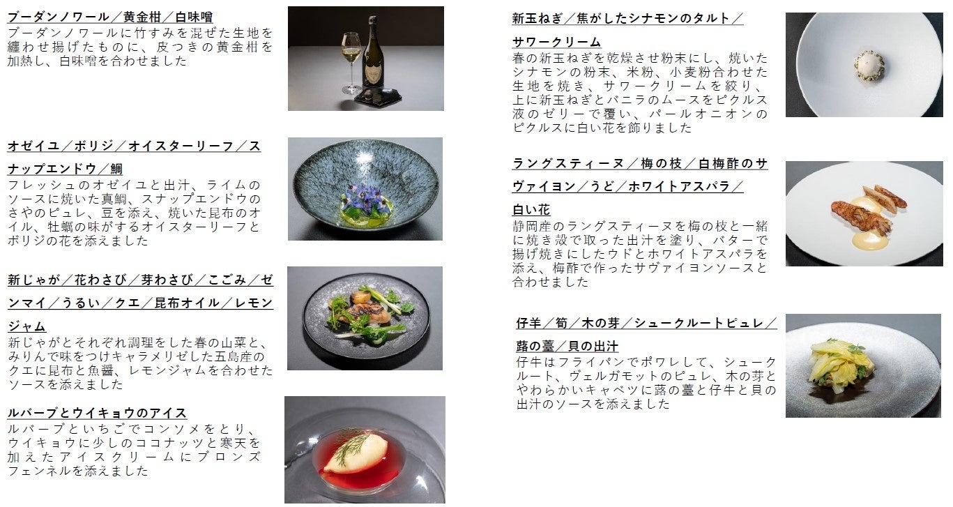 イベントの中で、ドン ぺリニヨンの醸造最高責任者であるヴァンサン・シャプロンは、「感情は今この瞬間のものですが、過去から生まれ、未来へと繋がるものでもあります。そこには時間の連続性があるという意識を、ドン ペリニヨンのチーム全員が共有しています。ドン ペリニヨンというブランドの恒久性は、過去・現在・未来の連続であり、時間の層を感じながら味わっていただきたいと思います。」と、ドン ペリニヨンに対する思いを語りました。また、今回のイベントでドン ペリニヨン ヴィンテージ 2013とのペアリングディッシュを担当した「La Cime(ラ・シーム)」の高田裕介シェフは、「ペアリングディッシュを創作するにあたって、柑橘や酸味の繋がりを意識しました。実際にフランスのシャンパーニュに行きドン ペリニヨンに触れた時に沢山ヒントをもらい、山菜など苦みのある食材に、油や出汁などでうまみを加えながらそこに柑橘を入れたりしてレイヤーをいれました。日本の酸の使い方を取り入れながら、ドン ペリニヨン ヴィンテージ 2013との相性を探りながら作りました。」とコメントしました。