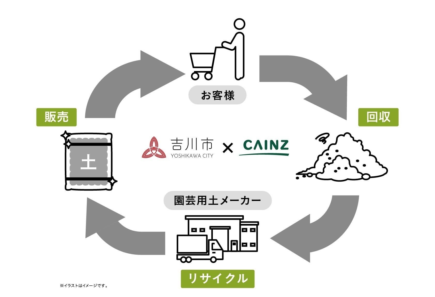 家庭で不用になった園芸用土をカインズ店舗で回収し、園芸用土メーカーで焼成・殺菌処理を行った上で、「循環型培養土」として再生し、カインズ店舗にて販売する仕組みです。