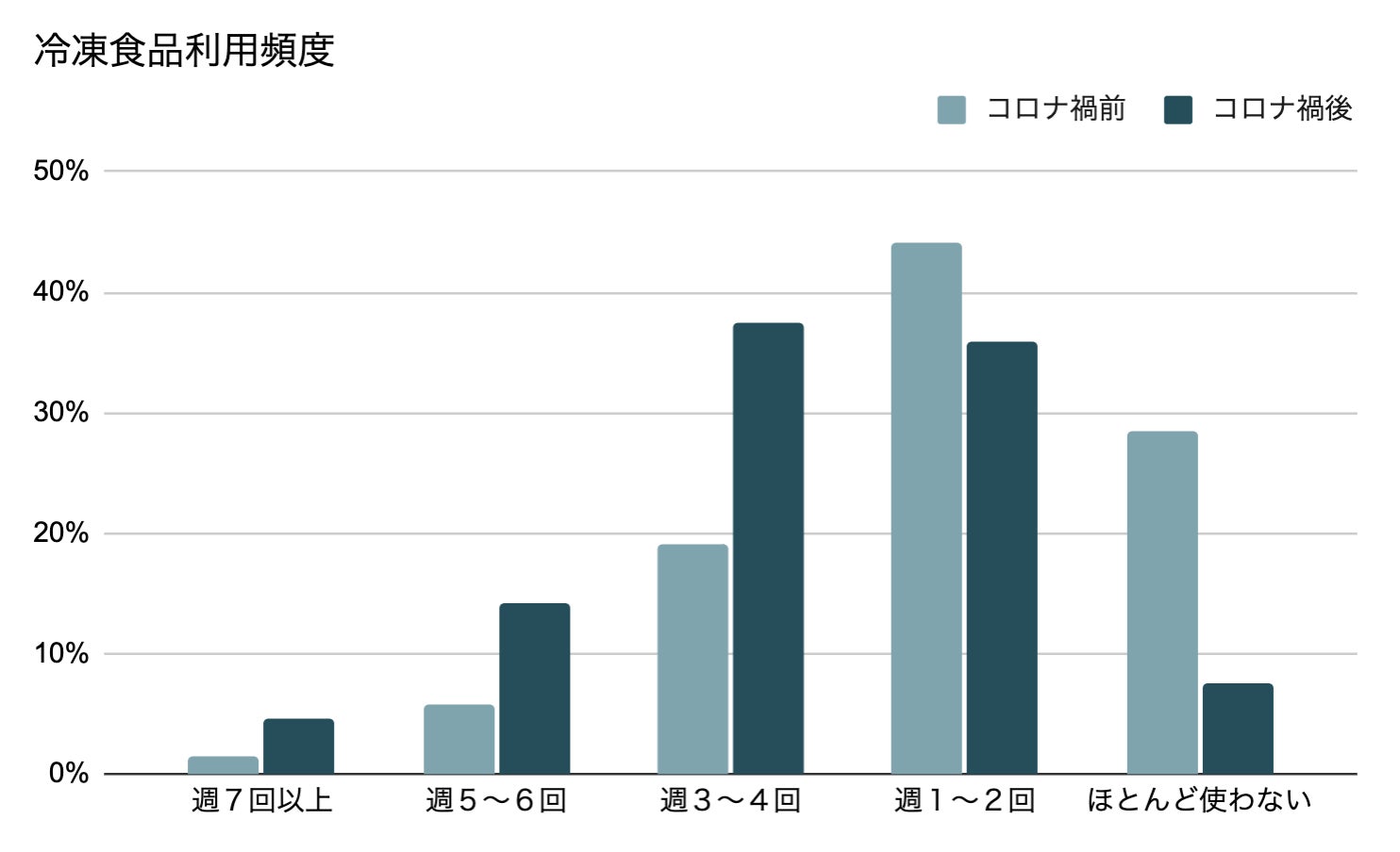 Oisixが、2022年2月16日〜2月17日の間、定期会員の方(回答者2,485名)に依頼したアンケート結果によると、全体の約66%の方がコロナ禍前と比較して冷凍食品の利用そのものが増えたと回答しました。特にコロナ禍前は週に1〜2回の利用者の割合が高かったのですが、週3日以上利用する方が増加している傾向にあり、週3〜4日の利用頻度の方は約2倍という結果でした。生活の変化により冷凍食品のニーズがより高まっていることがわかりました。