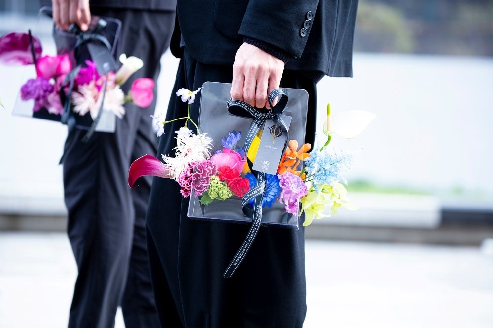 “街に行き交う人たちが花を手に思いを届け、幸せな世界を創っていきたい”と、透明のバッグ型フラワーボックスに仕立てました。母への思いが、街中に広がっていき母の日をきっかけに、より世界を花の力で彩りを与えていきたいという願いを込めています。