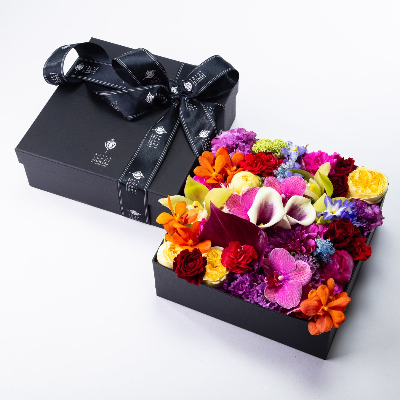 レザーのような風合いの高級感あふれるフラワーボックス。一枚の絵を描くように、独特な立体感にダイナミックかつ繊細にアレンジされた花々で特別なギフトに仕上げます。