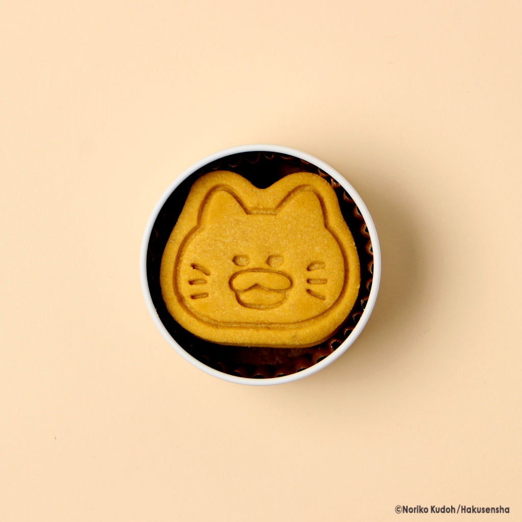 缶のデザインはこのコラボクッキーを狙っているノラネコが描かれている、ここでしか手に入らないオリジナルデザインです。絵本の主人公であるノラネコのかおのクッキーが詰まっています。