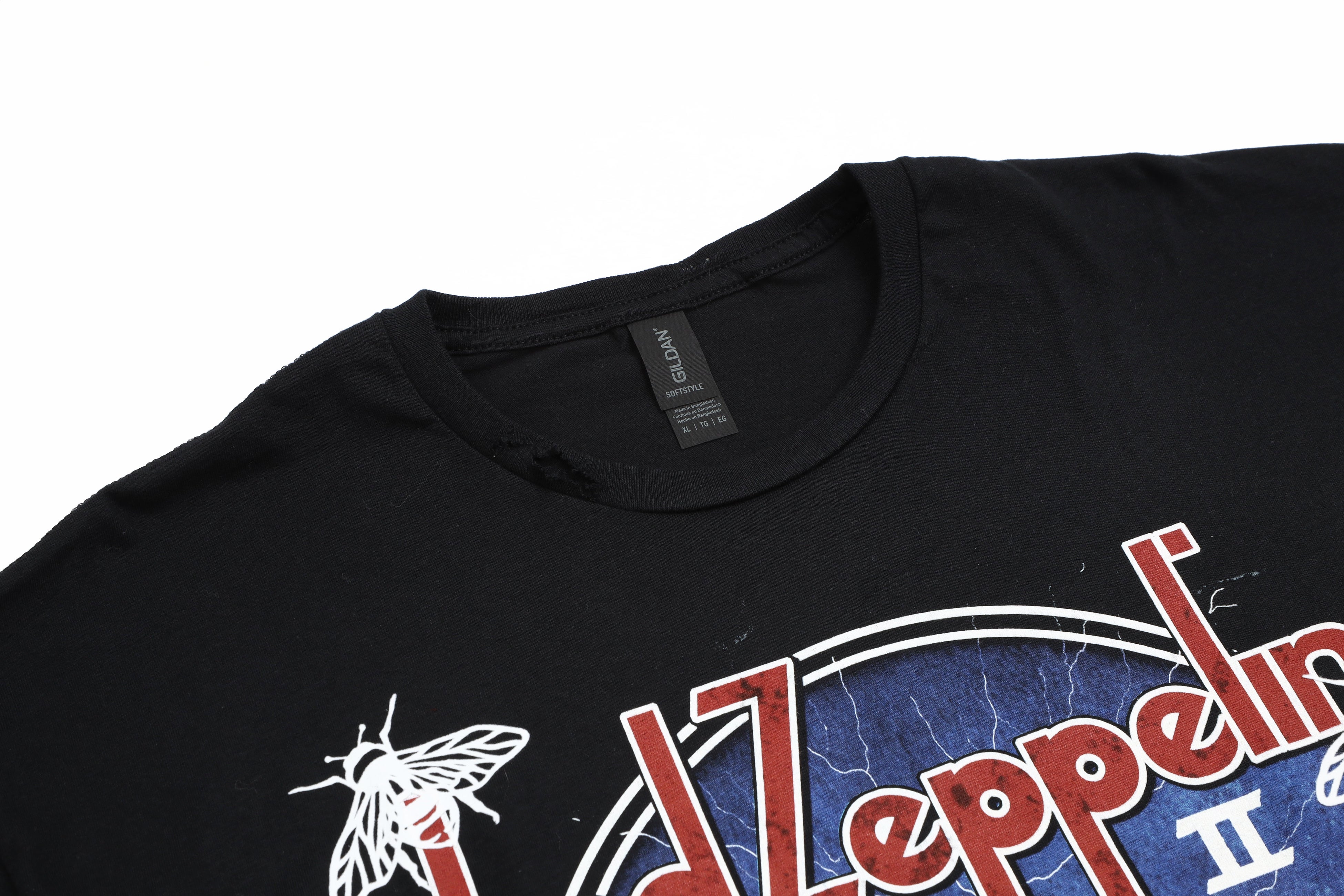 今回発売された「Led Zeppelin Customized by PRINCIPE prive」は、新品のバンドTシャツをベースとしていながら、ビンテージの風合いを兼ね備えているのが特徴です。襟口、袖口などに施されたダメージ加工、それとは対照的なコントラストの効いたフロッキープリントが合わさることで新旧の融合したプリンチペスタイルが完成します。