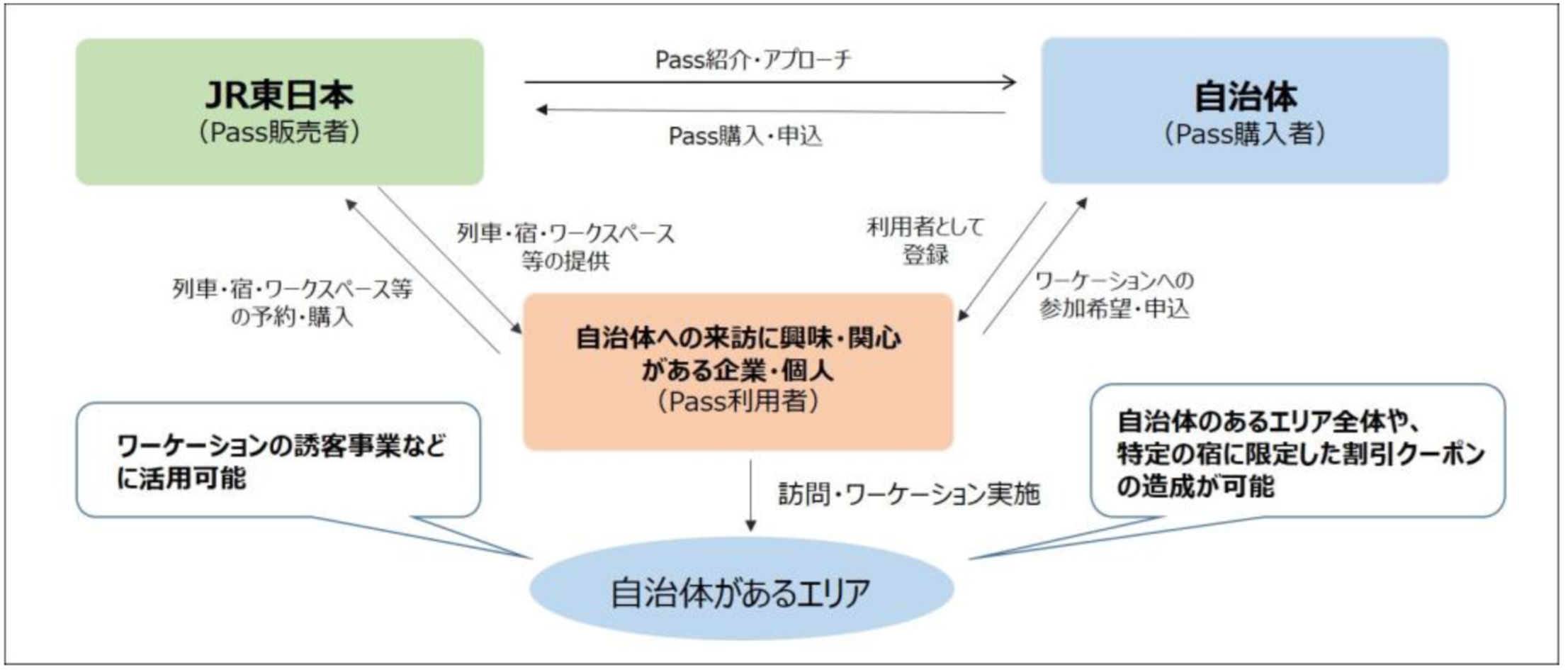 「JRE Workation Pass 2023」は、誘客を希望する自治体が、そのエリアへの訪問に興味・関心がある企業・個人とのつながりを作ることなどを目的としてご活用いただけます。クーポンは、特定のエリアや宿に限定した設定も可能です。人材や企業価値を高めたい企業ニーズと、関係人口の創出、事業の活性化および企業との関係性の構築などを図りたい自治体ニーズを結びつけることで、企業・人・地域社会の「Well-being」の向上に取り組みます。