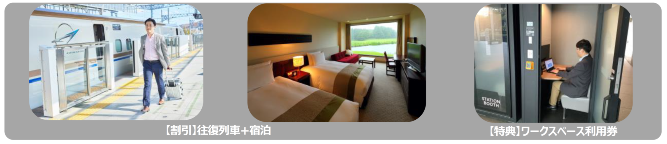 ※旅行のスタイルに合わせて「列車と宿泊」を自由に組み合わせられる「JR東日本びゅうダイナミックレールパック」の予約サイトにおいてクーポンを使用してお得にご利用いただけます。ワークスペース利用券は、JR東日本が展開する「STATION BOOTH」が利用対象となり、会員登録を行うと予約してご利用いただけます。