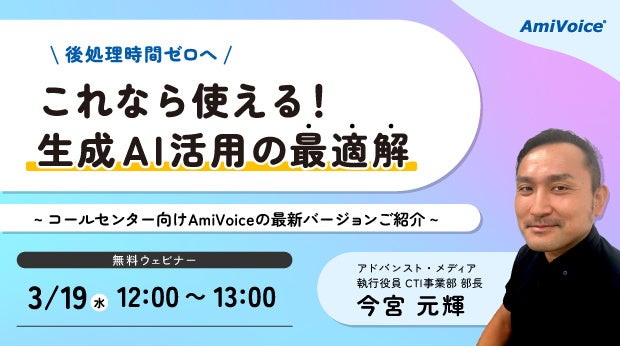 2025年3月19日(水)、株式会社アドバンスト・メディア(本社:東京都豊島区、代表取締役会長兼社長:鈴木清幸 以下、アドバンスト・メディア)は、「<後処理時間ゼロへ>これなら使える!生成AI活用の最適解~コールセンター向けAmiVoiceの最新バージョンご紹介~」を開催いたします。