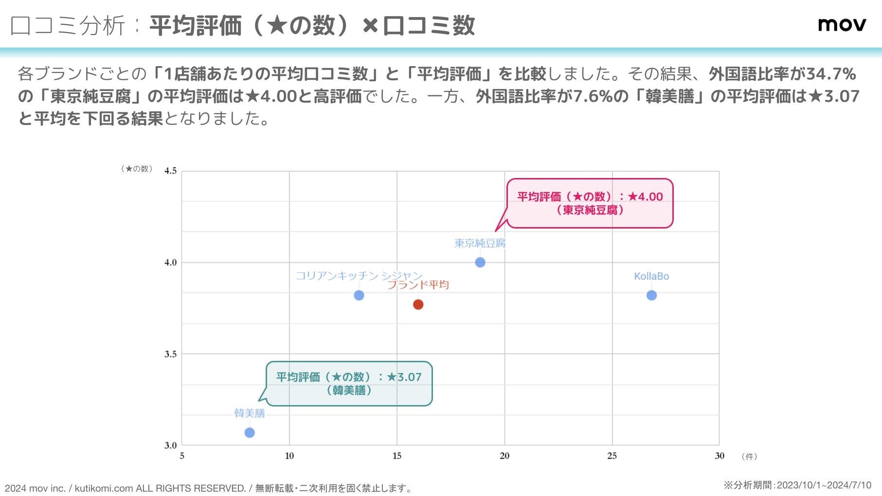 各ブランドごとの「1店舗あたりの平均口コミ数」と「平均評価」を比較しました。その結果、外国語比率が34.7%の「東京純豆腐」の平均評価は★4.00と高評価でした。一方、外国語比率が7.6%の「韓美膳」の平均評価は★3.07と平均を下回る結果となりました。