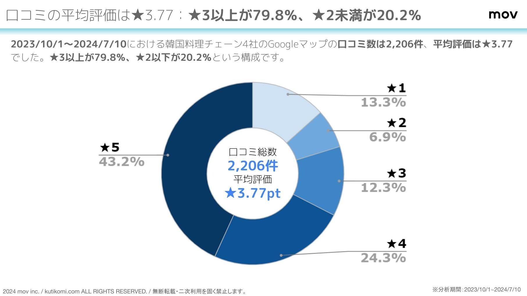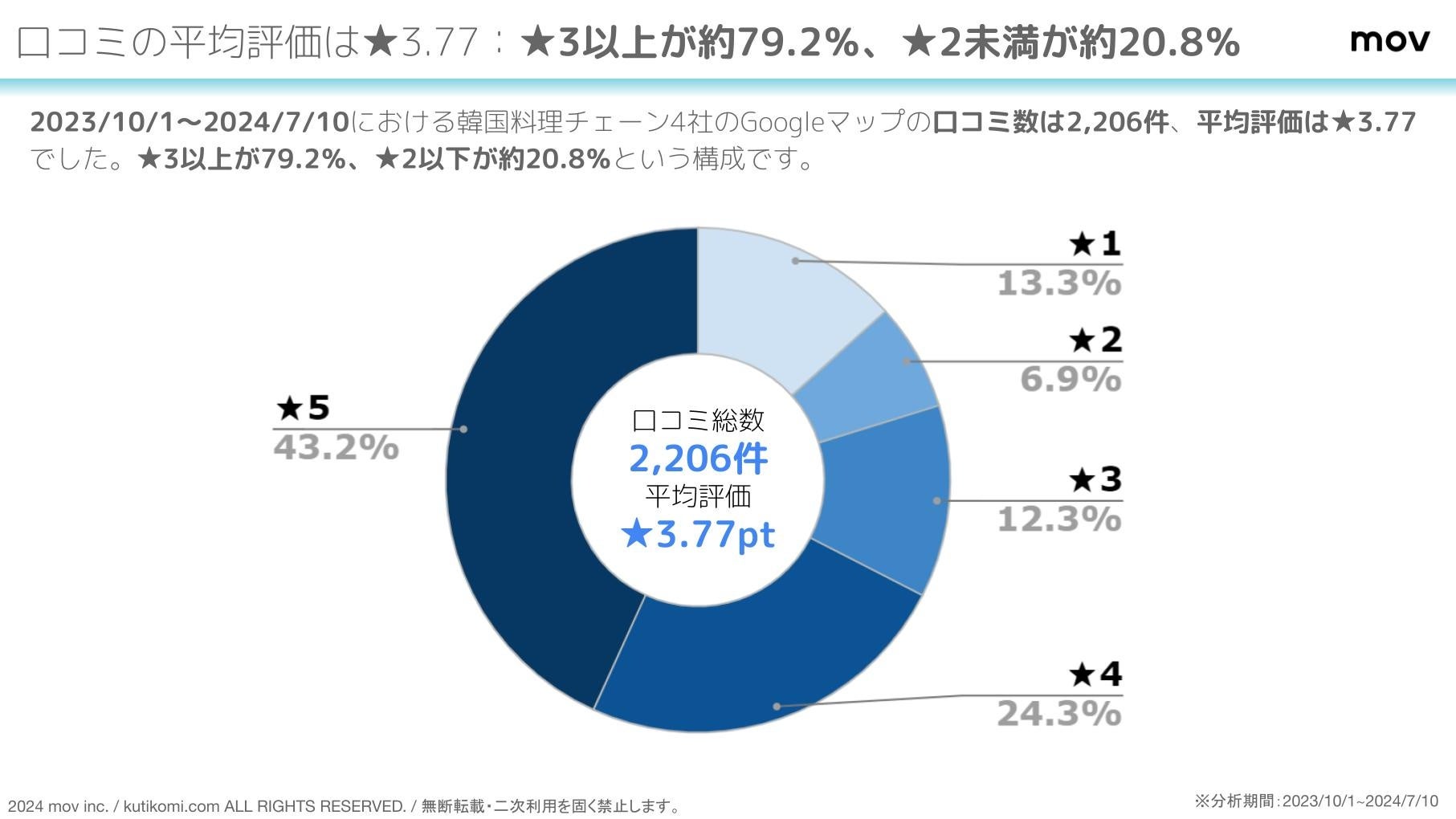 2023/10/1~2024/7/10における韓国料理チェーン4社のGoogleマップの口コミ数は2,206件、平均評価は★3.77でした。★3以上が79.8%、★2以下が20.2%という構成です。