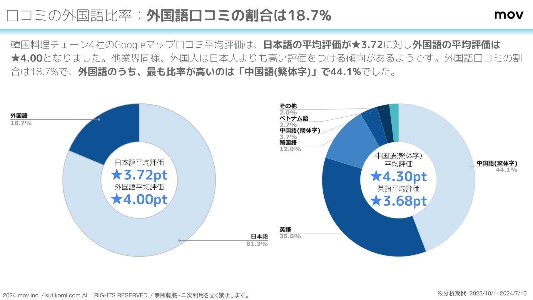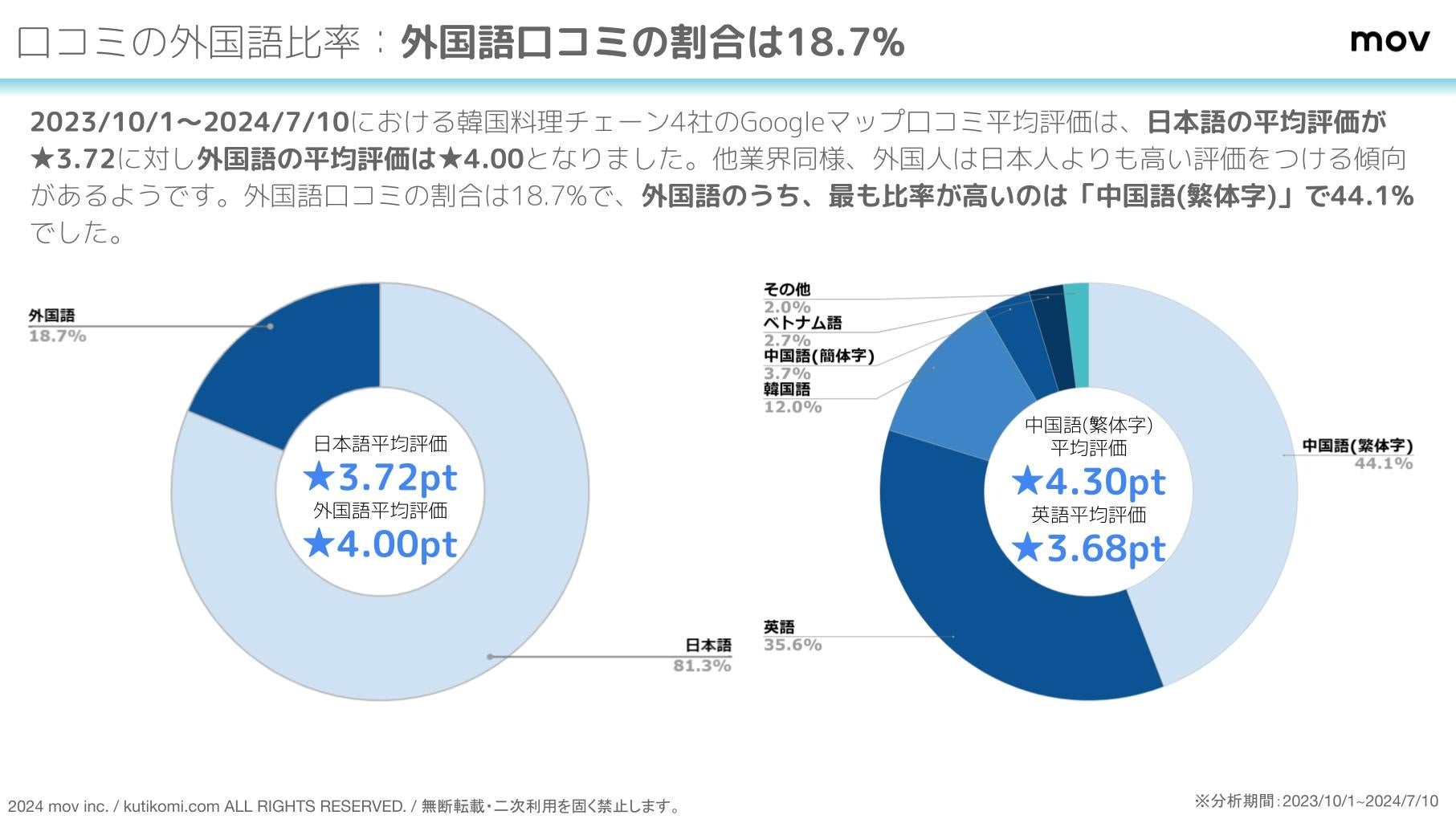 外国語口コミの割合は18.7%で、外国語のうち、最も比率が高いのは「中国語(繁体字)」で44.1%でした。