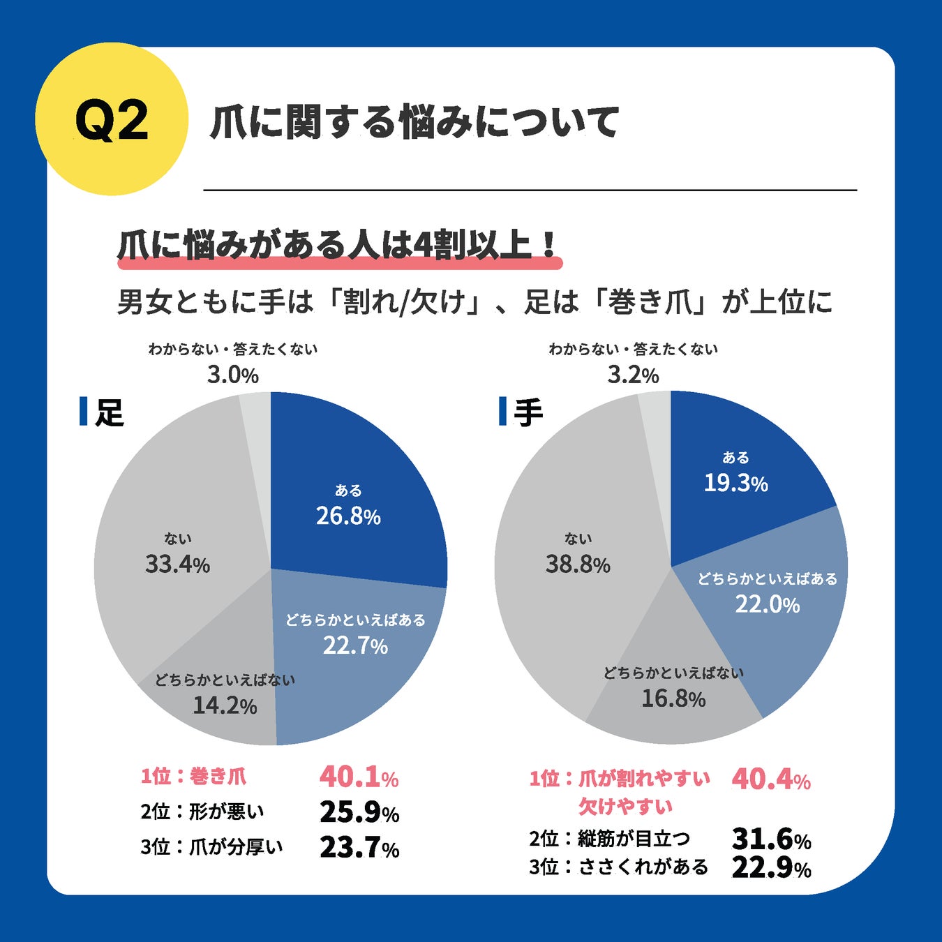 具体的な悩みについて、足の爪については「巻き爪」「形が悪い」「爪が分厚い」、手の爪については「爪が割れやすい・欠けやすい」「縦筋が目立つ」「ささくれがある」が上位に挙がりました。