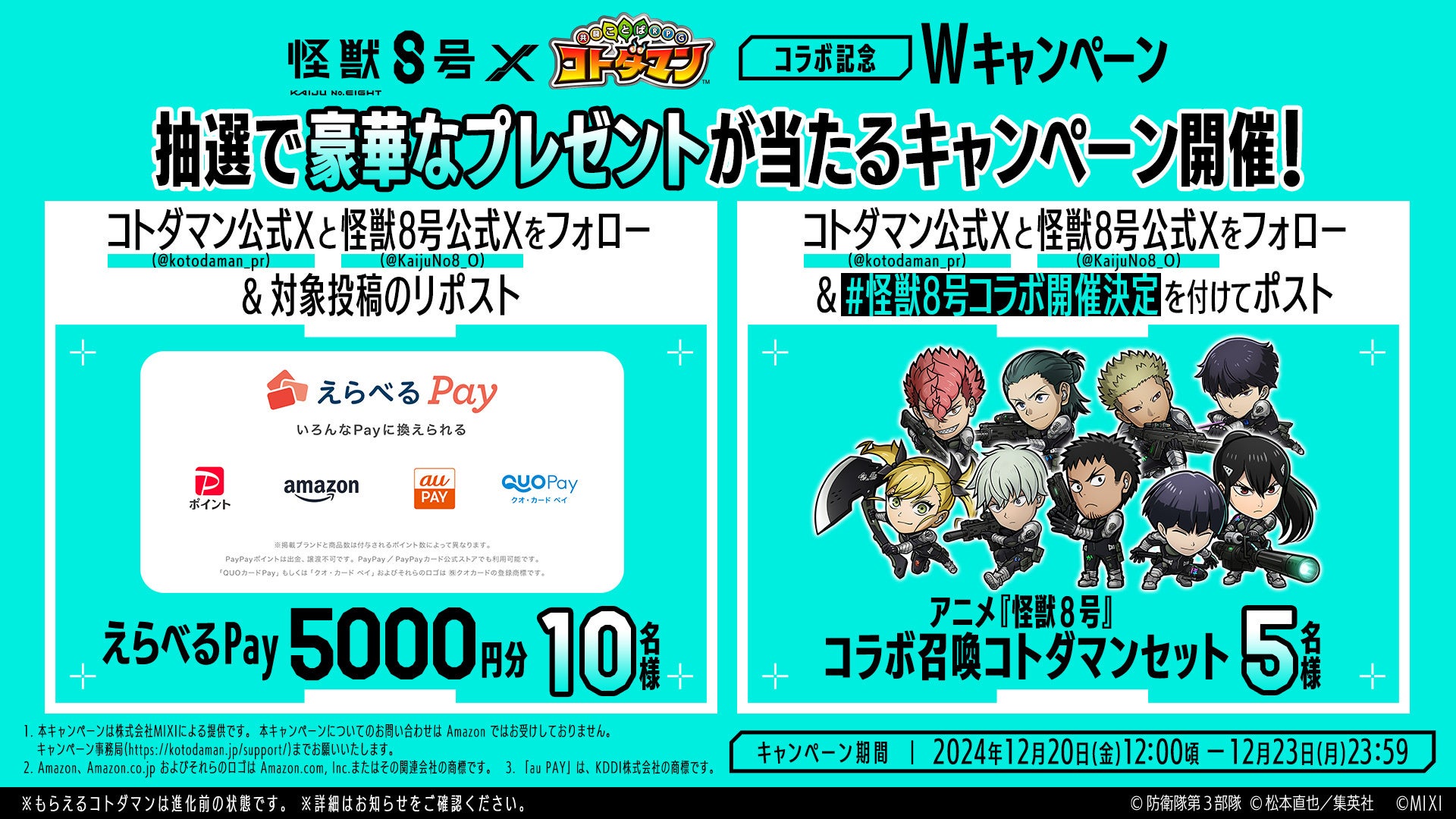・「えらべるPay」5,000円分・・・10名様 ・アニメ『怪獣8号』コラボ召喚コトダマンセット・・・5名様 |