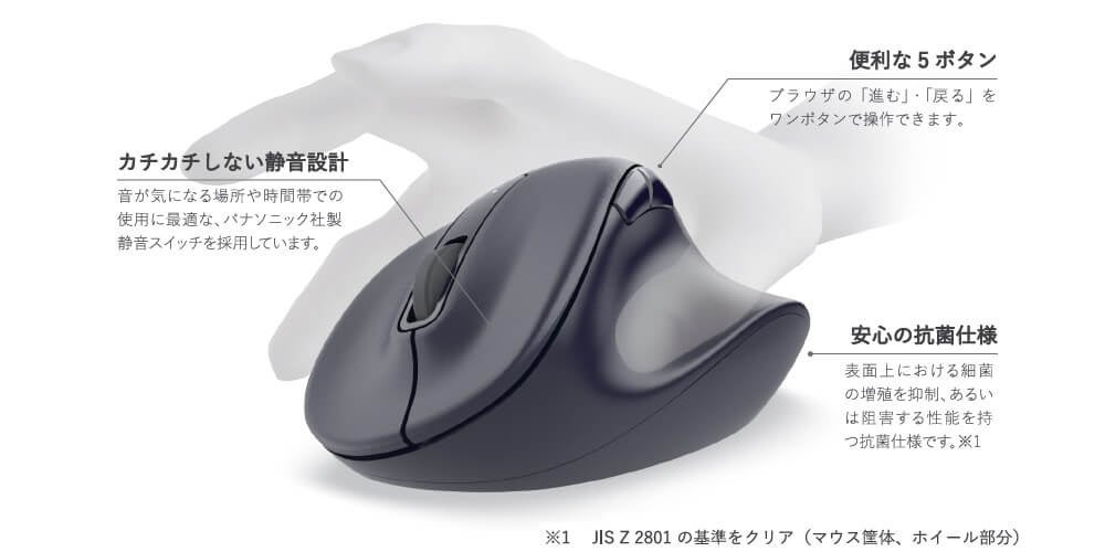 左右ボタンは高い耐久性とともに、カチカチ音がしないパナソニック社製の静音スイッチを採用しており、静かな場所でも周囲を気にせず操作できます。また、抗菌加工により、マウスの表面に付着した菌の繁殖を抑えて清潔に保つことができます。