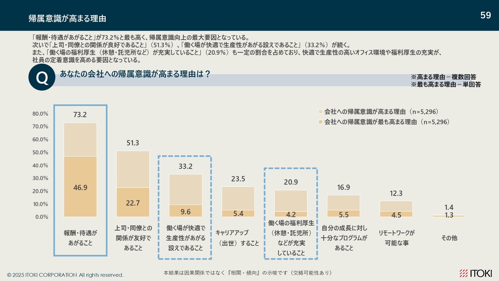 これらを総合すると、帰属意識は「給与・待遇」だけではなく、「関係性」と「環境」の三軸で高まりやすい構造がうかがえます。とくにオフィス環境は心理的な安心感や働きやすさと結びつき、長期的な定着を下支えする要素として機能していると考えられます。