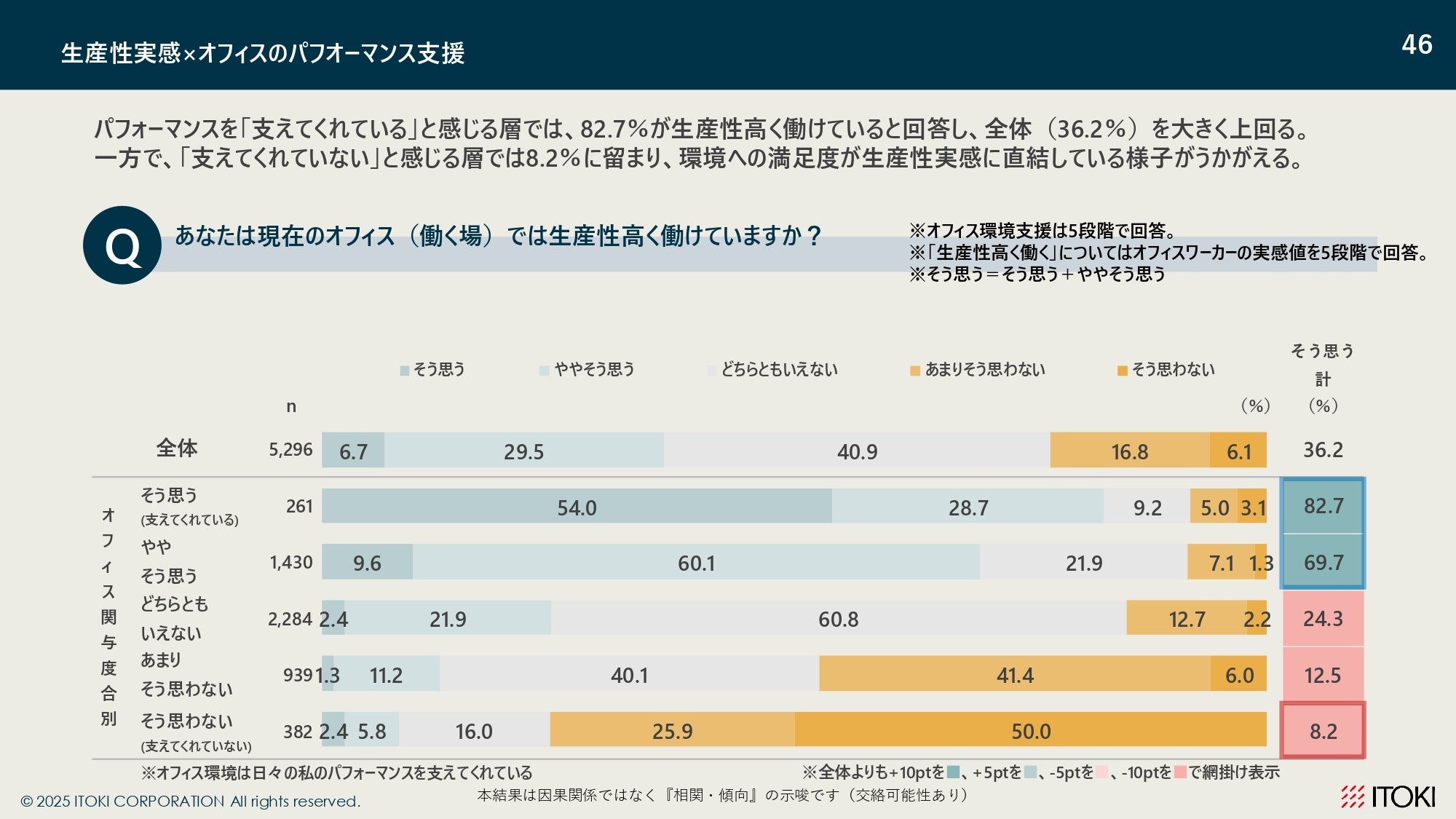 株式会社イトーキ(本社:東京都中央区、代表取締役社長:湊 宏司)は、全国 5,296 名のオフィスワーカーを対象に「オフィスワーカーの意識調査2025-多様化する働きがいと出社価値の再定義に向けて」を実施しました。働き方の選択肢が広がるなか、本調査では勤務形態や出社意識、働きたいと感じる理由、働き続けたい条件など“人起点”の実態を幅広く調査しました。また、こうした心理や行動が、集中・協働・成長・業務効率といった環境支援の体感とどのように関連するかを分析したところ、年代ごとに異なるモチベーションの構造と、環境→心理→行動へと連なる連鎖的な関係が示唆されました。支援を体感できる環境では生産性の自己評価が最大約10倍に達するなど、働く場のあり方が意欲や成果と幅広く結びつく傾向が確認されています。