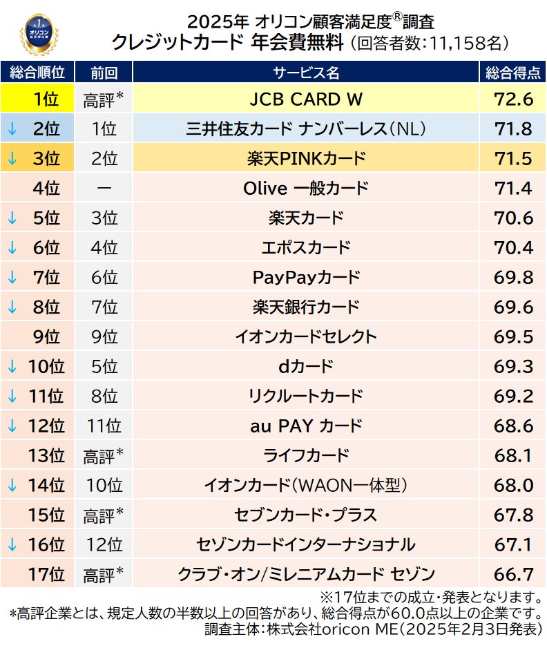 2025年 オリコン顧客満足度®調査 クレジットカード 年会費無料