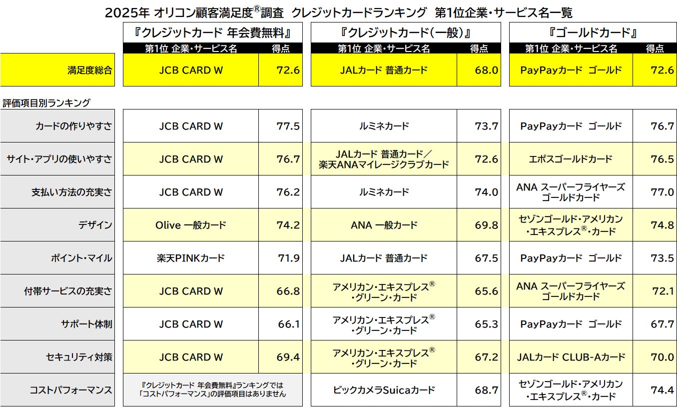 2025年 満足度の高い 『クレジットカード』 ランキング | 『ゴールドカード』は【PayPayカード ゴールド】が総合1位 「ポイント・マイル」など3項目で1位に(オリコン顧客満足度調査)