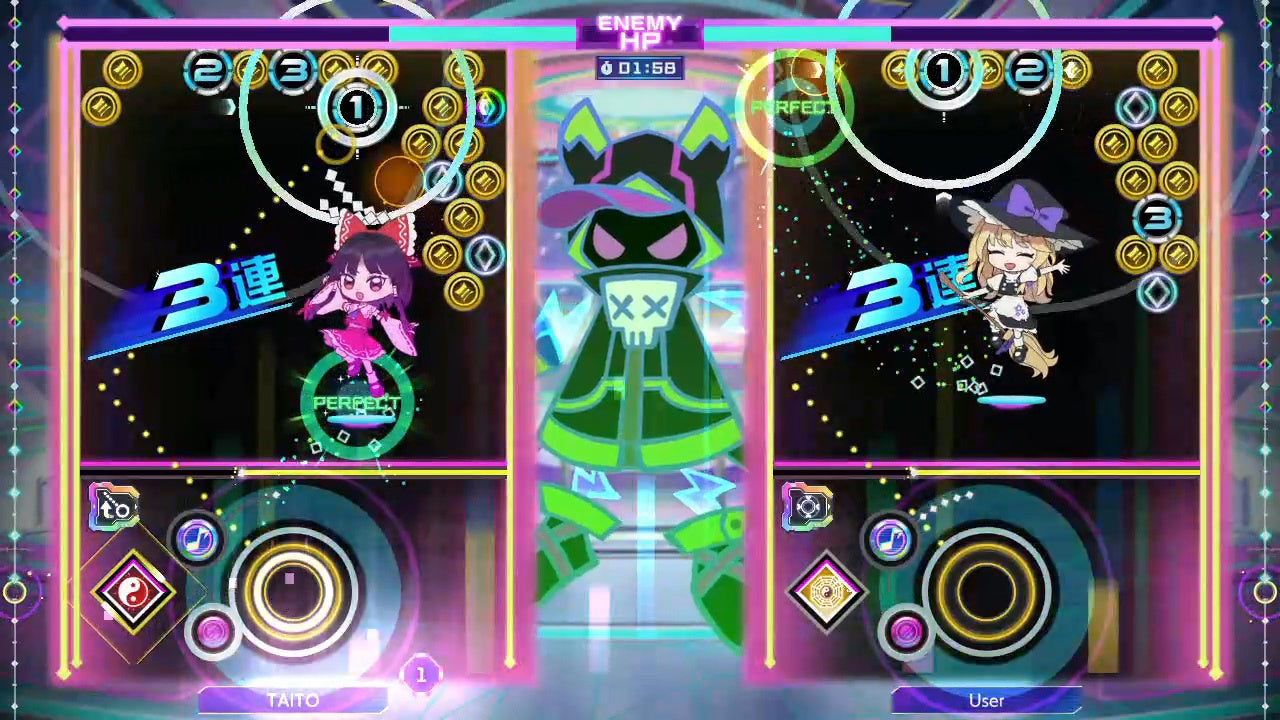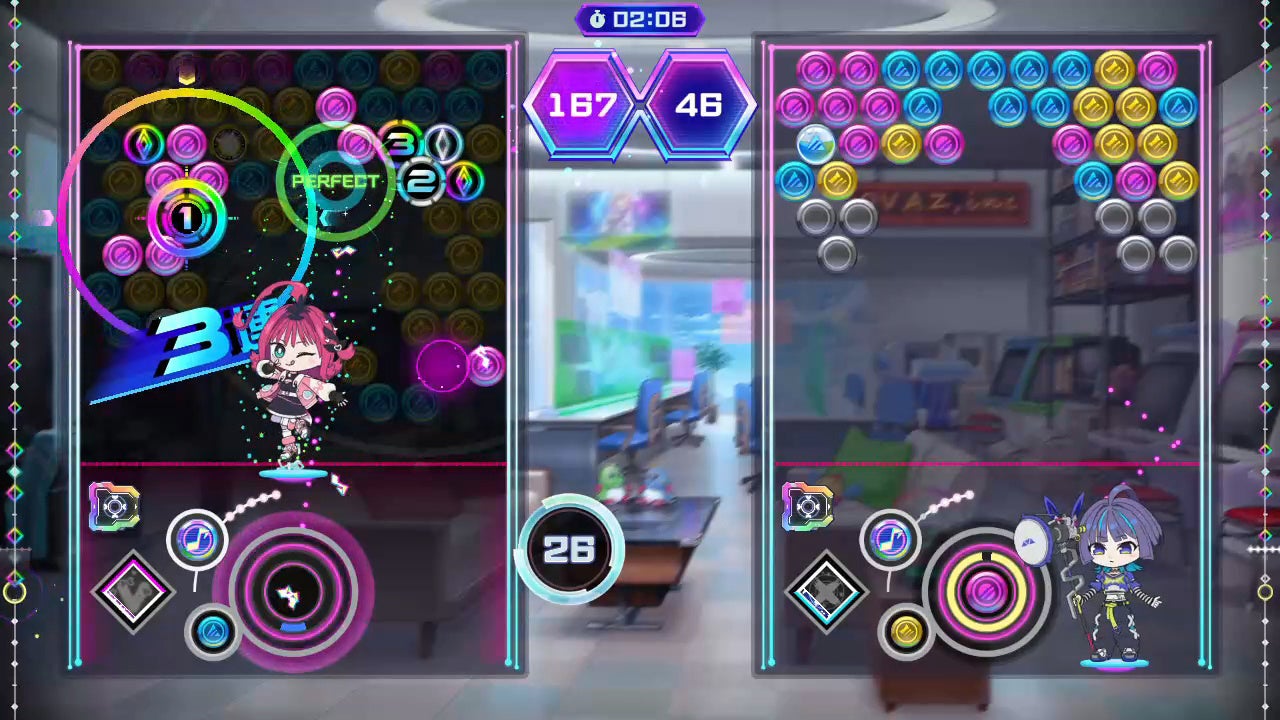 バブルシューティングを得意とするタイトーが手掛ける音楽ゲームの要素を加えた対戦パズルゲームで、完全オリジナル作品です。直感的に楽しめるバブルシューティングと、音楽に合わせてボタンを押すだけの音楽ゲームをミックスした、誰でもテンションバク上がりで楽しめるリズミカルパズルゲームです。遊べるモードは3種類あり、1人でも2人でも、オンライン・オフラインで対戦や協力バトルが楽しめます。アニメ・ポップス、VTuber、バーチャルシンガー、東方アレンジ、オリジナルなど、人気曲を全56曲収録しています。さらに、有償追加のダウンロードコンテンツも続々登場予定です。
