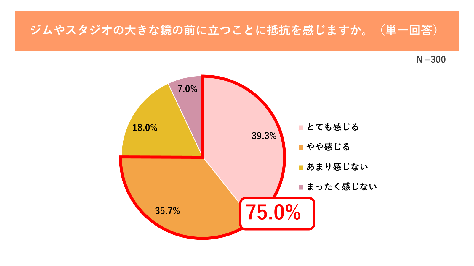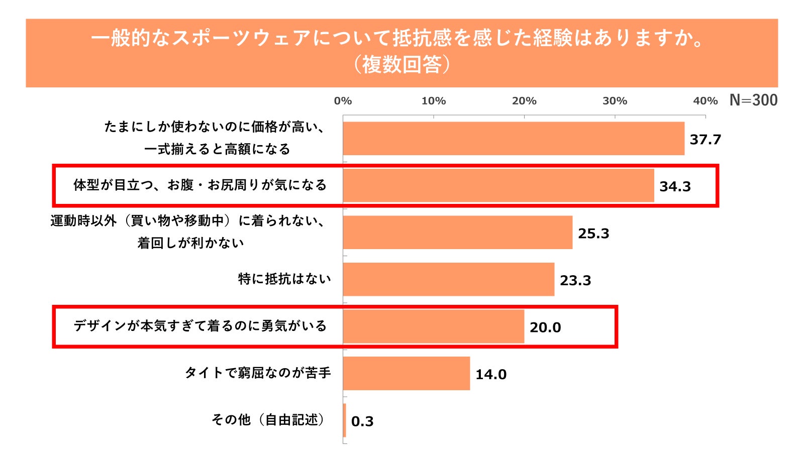 二つ目は、「鏡や人目」による心理的な気後れです。75.0%が「ジムやスタジオの鏡の前に立って運動することに抵抗がある」と感じており(図10参照)、さらに一般的なスポーツウェアに対しても「体型が目立つ」(34.3%)、「デザインが本気すぎて着るのに勇気がいる」(20.0%)といった声が挙がりました(図11参照)。