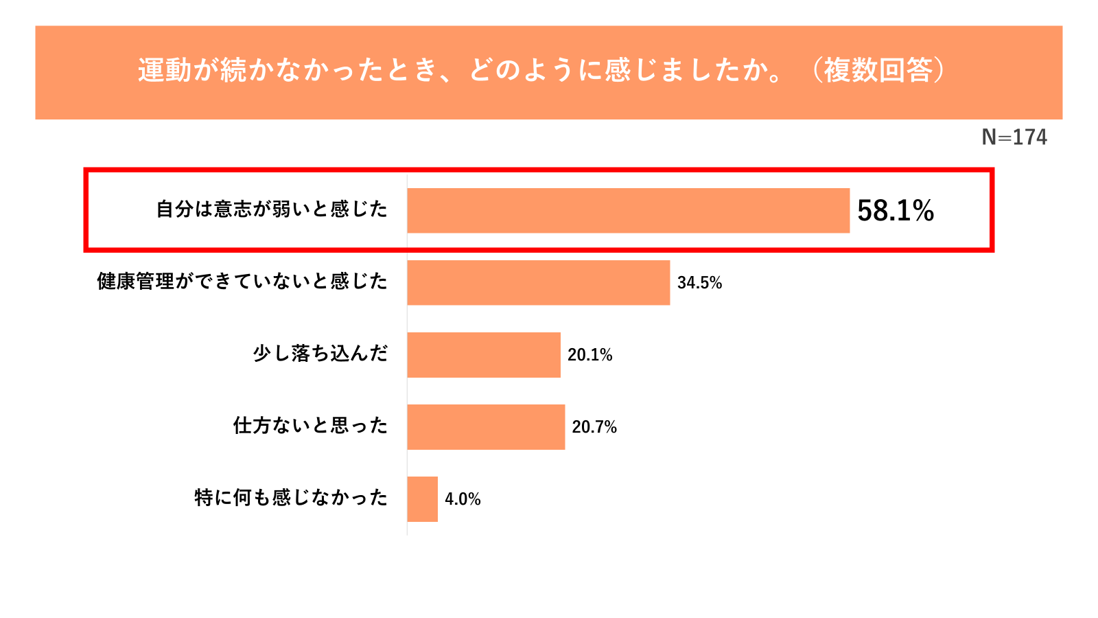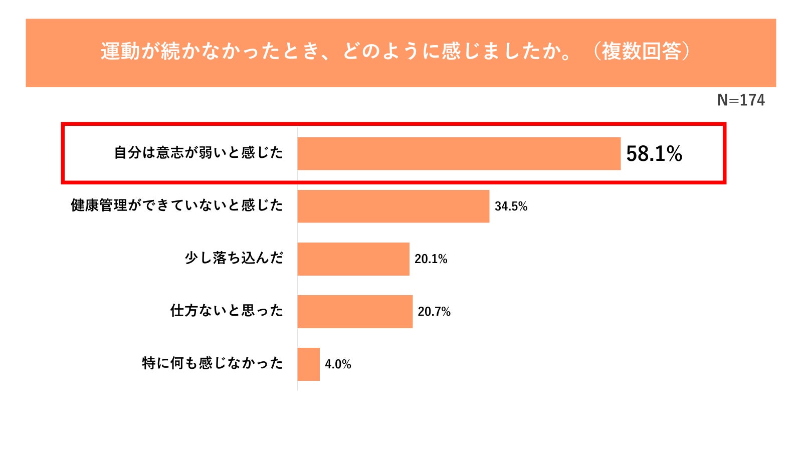 さらに、そのうち半数以上(58.1%)が、運動が継続できないことに対して「自分は意志が弱いと感じた」と回答しています。また、「健康管理ができていないと感じた(34.5%)」や「少し落ち込んだ(20.1%)」といった声も多く寄せられました(図6参照)。
