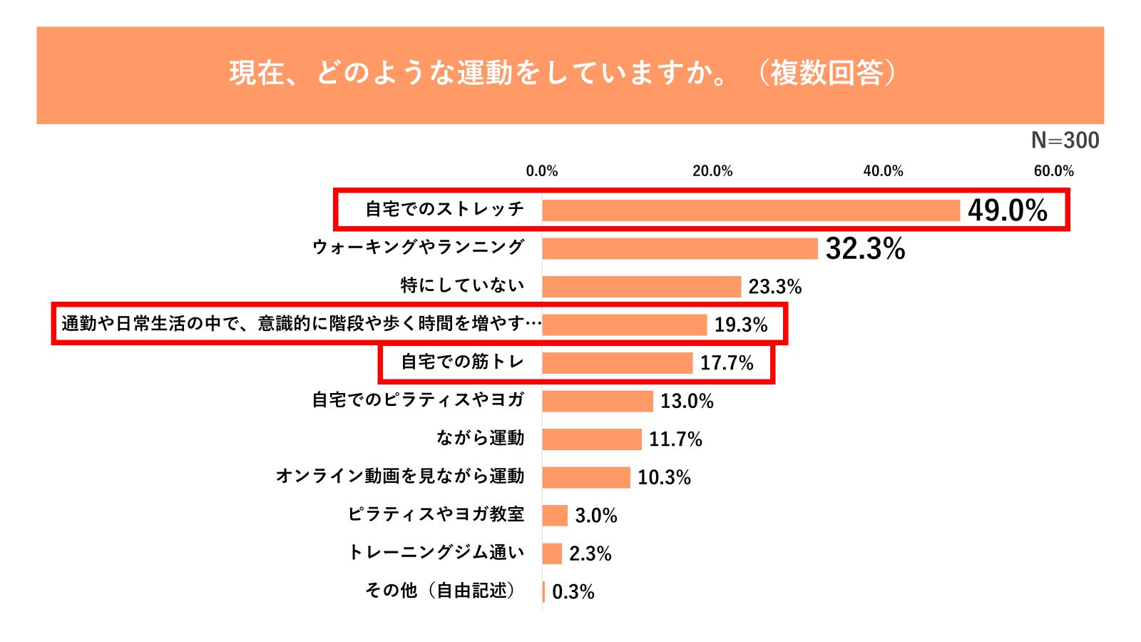 現在取り入れている運動について調査したところ、「ジム通い(2.33%)」などの“わざわざ運動”よりも、「自宅でのストレッチ(49.0%)」や「通勤や日常生活の中で意識的に歩く時間を増やす(19.3%)」など、生活動線の中での活動が中心となっている実態が分かりました(図3参照)。