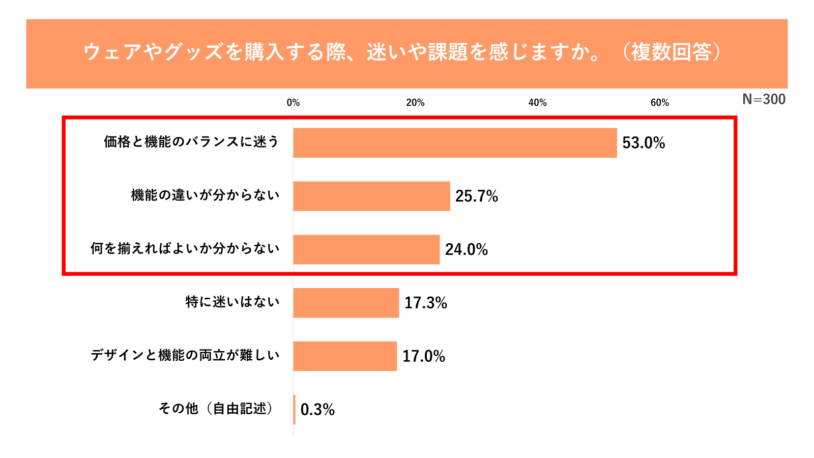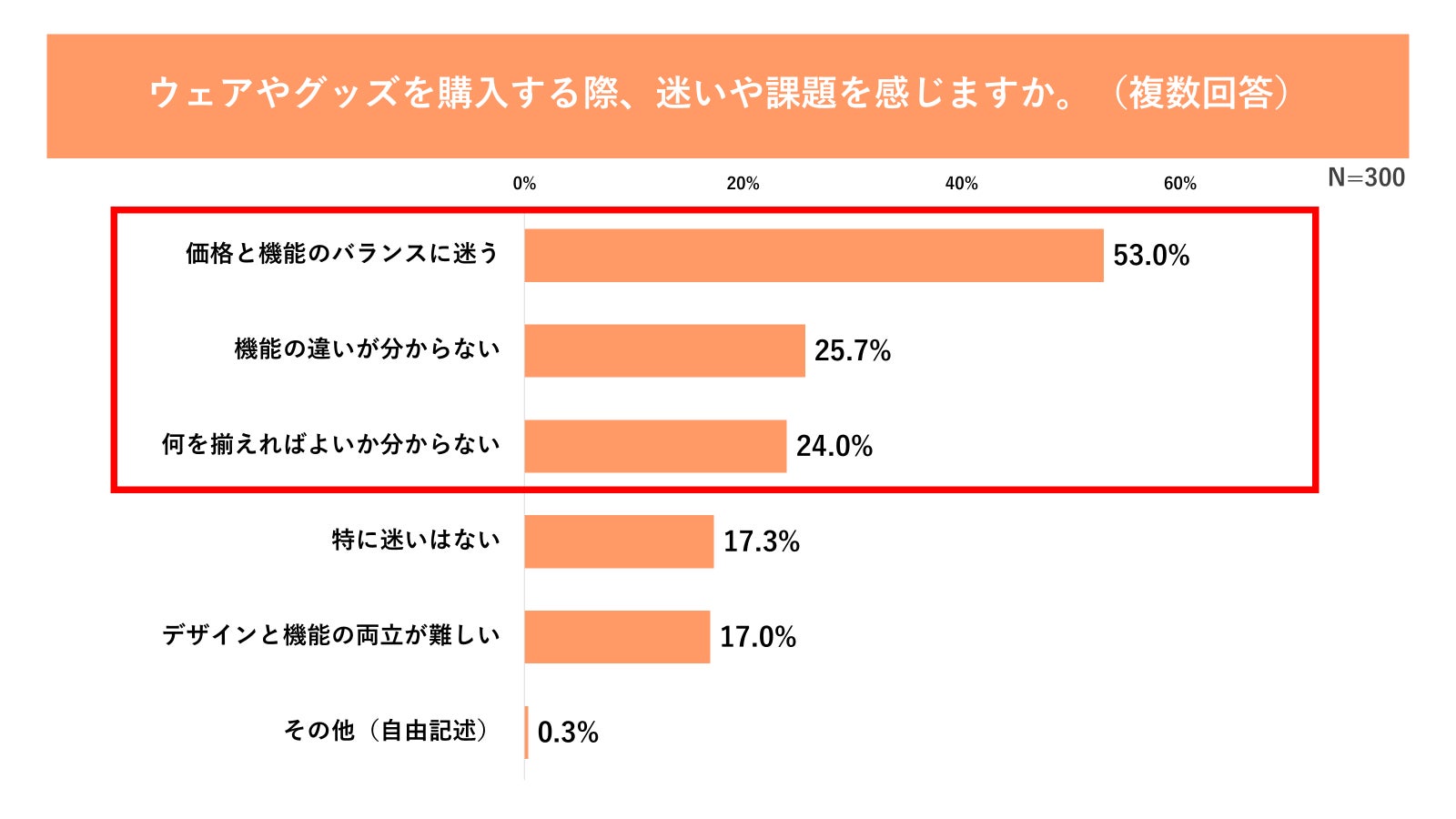 三つ目は、「選択」に伴うストレスです。運動を始める際のアイテム選びにおいて、53.0%が「価格と機能のバランスに迷う」と回答しており、「何を揃えればよいか分からない(24.0%)」といった不安も含め、運動を開始する前の「選択」という工程自体も心理的コストとなっている実態が判明しました(図10参照)。