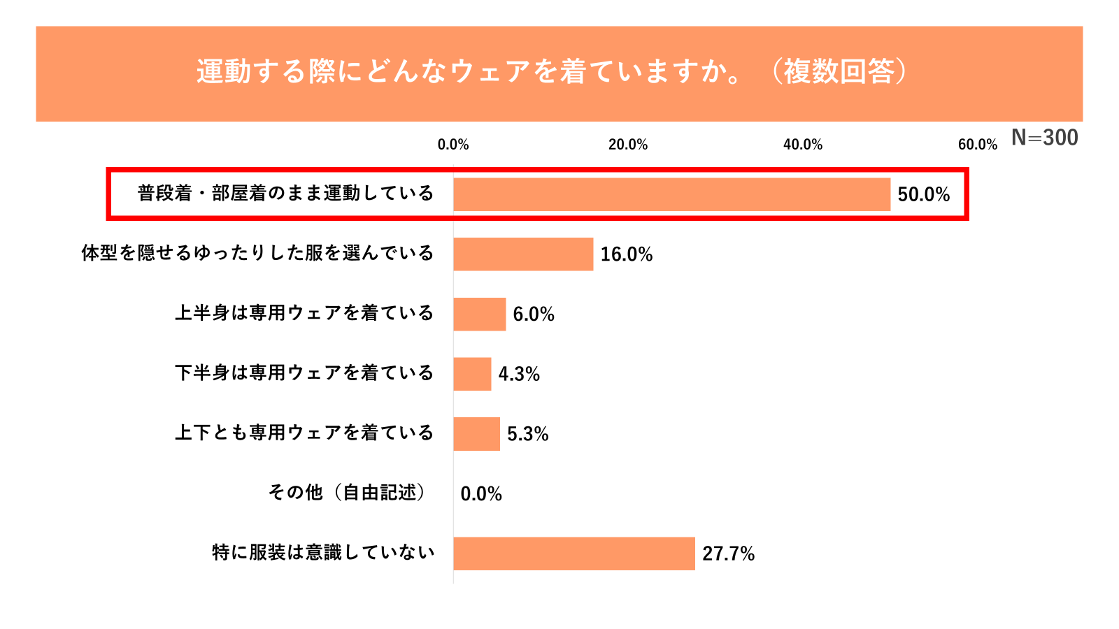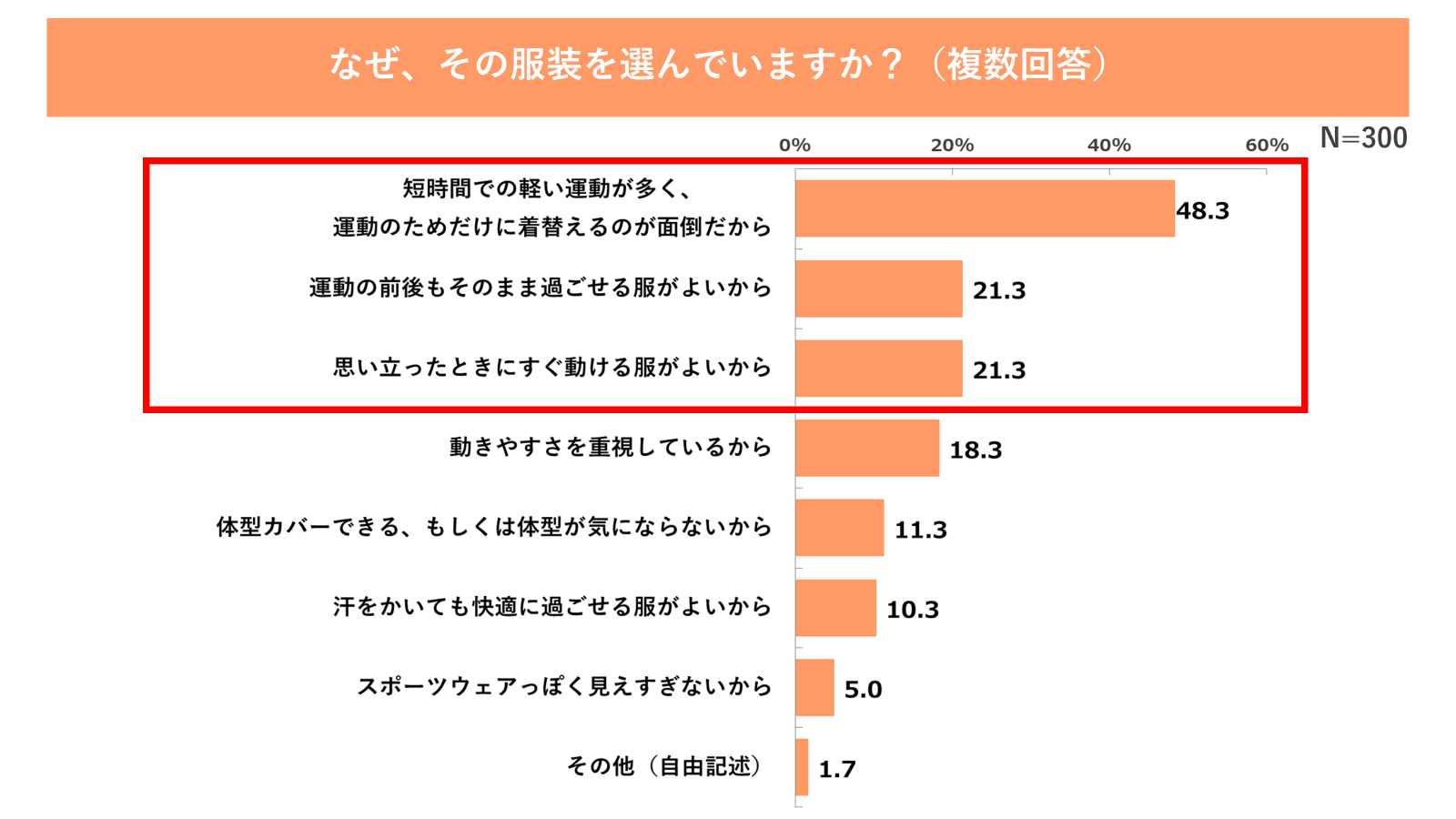 まず一つ目は、「着替え」という準備コストです。運動時の服装について尋ねたところ、50.0%と半数が「普段着・部屋着のまま運動している」と回答(図7参照)。その理由としては「短時間での軽い運動が多く、運動のためだけに着替えるのが面倒だから」(48.3%)が最も多く、次いで「運動の前後もそのまま過ごせる服がよい」(21.3%)、「思い立ったときにすぐ動ける服がよい」(21.3%)といった声もそれぞれ約2割にのぼりました(図8参照)。