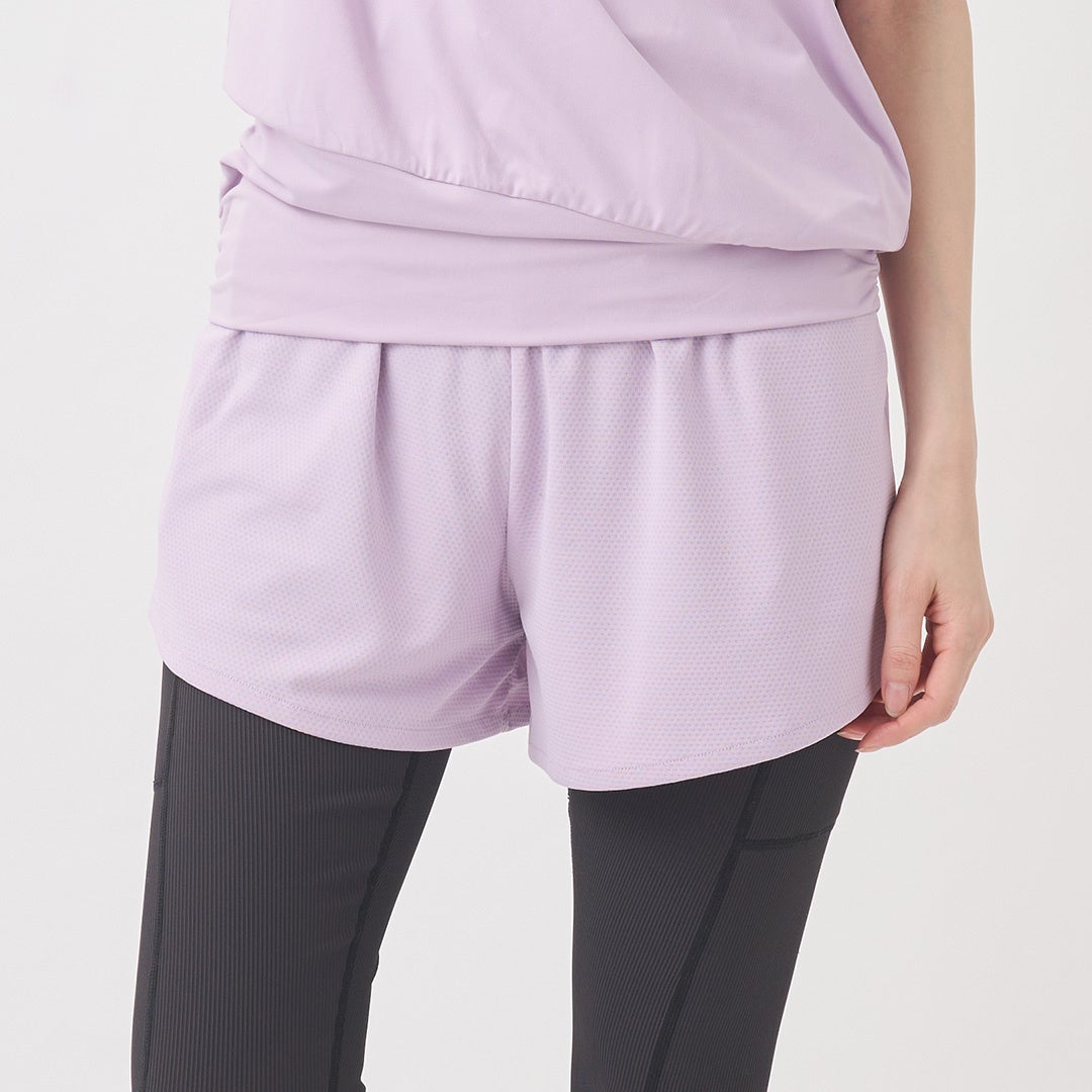 レギンスを履きたいけど、お尻・お腹・太ももが気になる人向け、スタイルカバーが叶うショートパンツ。全体のギャザーがおなか周りをカバーしつつすっきりとしたシルエットに見せてくれます。