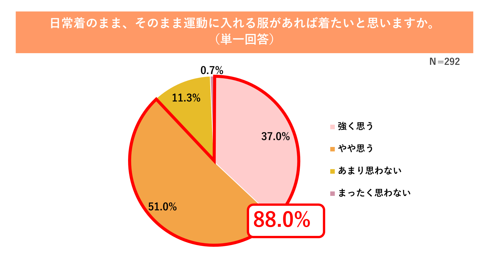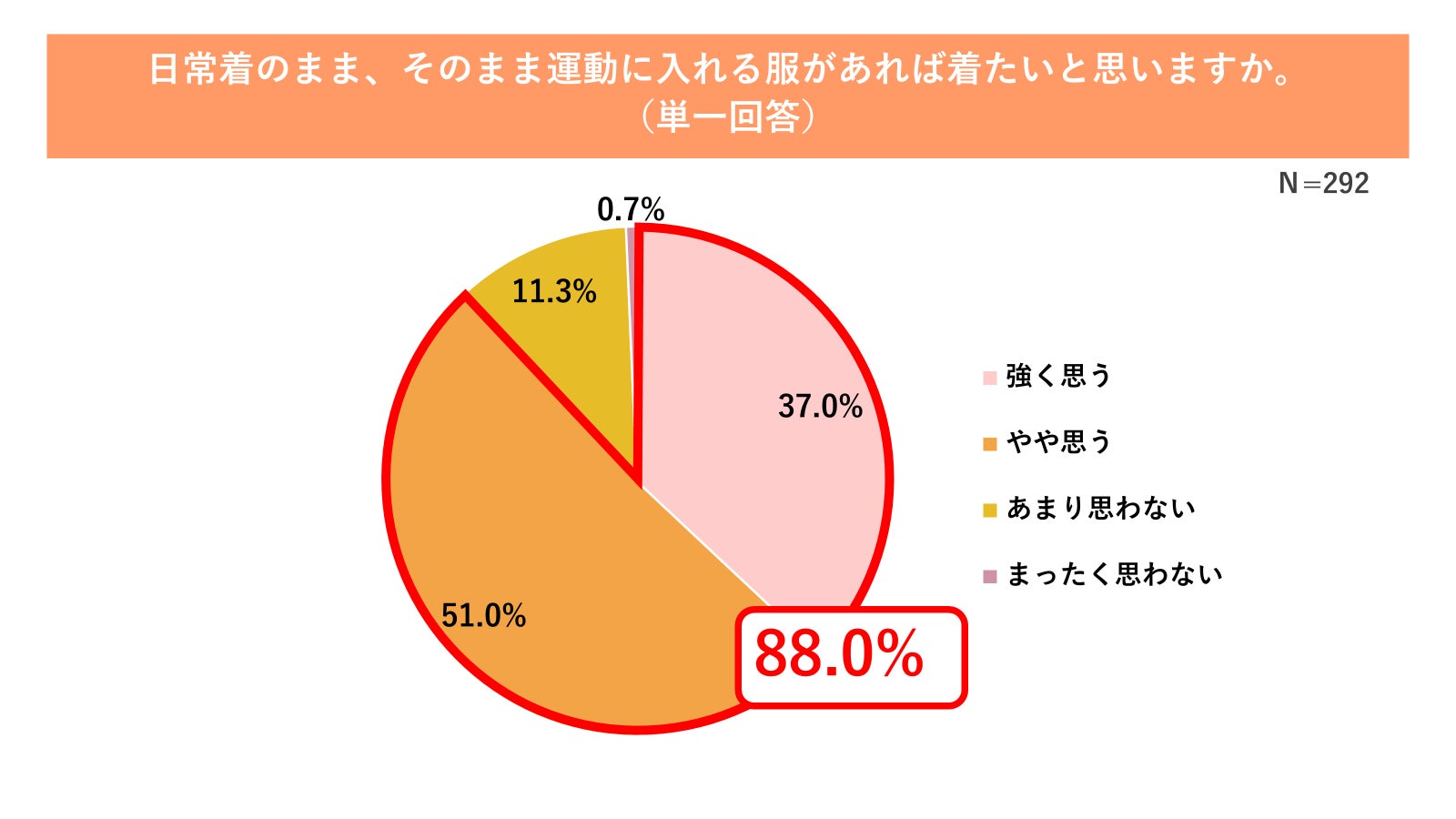 こうした「着替えの負担」と「日常と運動のシームレス化」への関心は極めて高く、88.0%もの人が「日常着のまま、そのまま運動に入れる服があれば着たい」と回答しました(図9参照)。