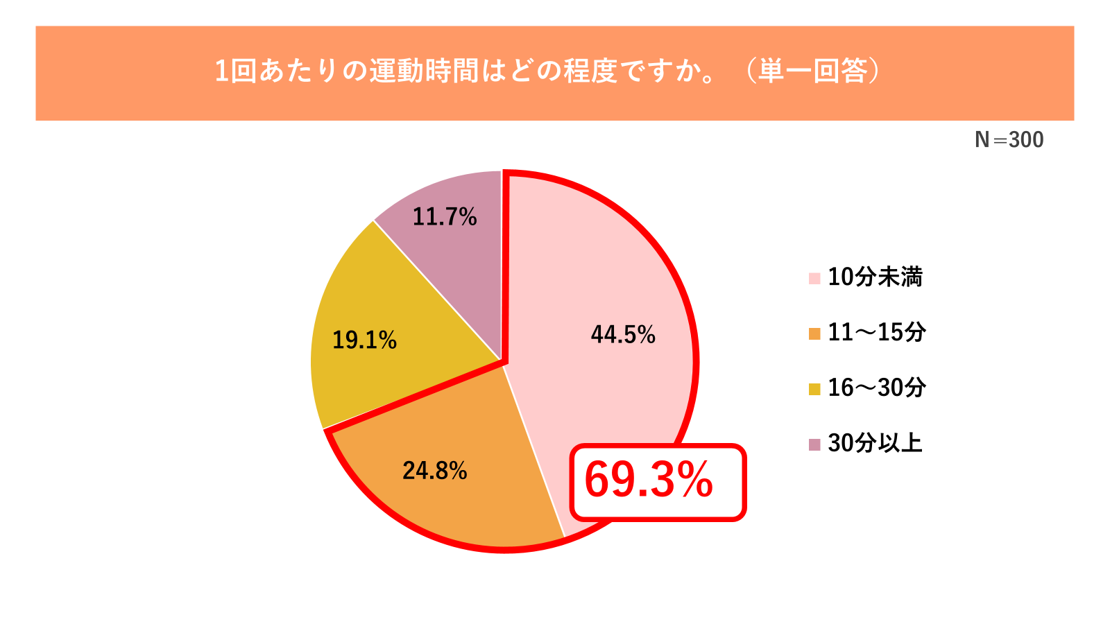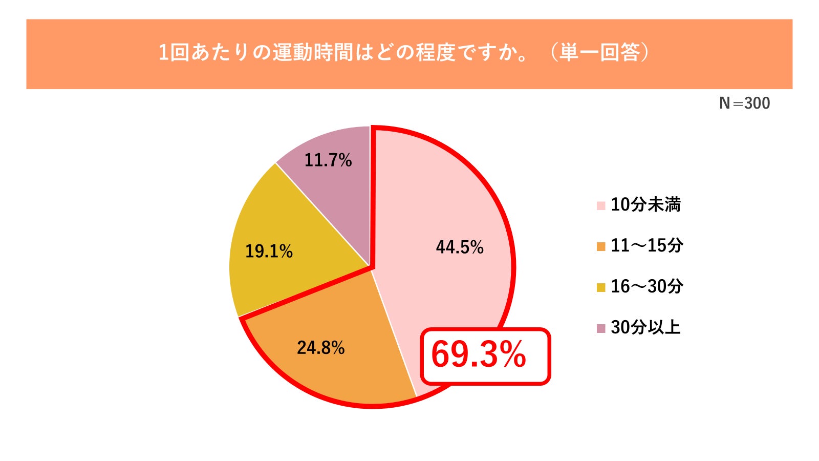 一方で、実際の運動実態を見ると「10分未満(44.5%)」が最多で、「11〜15分(24.8%)」と合わせると15分以内で運動している人は約7割にのぼります(図2参照)。