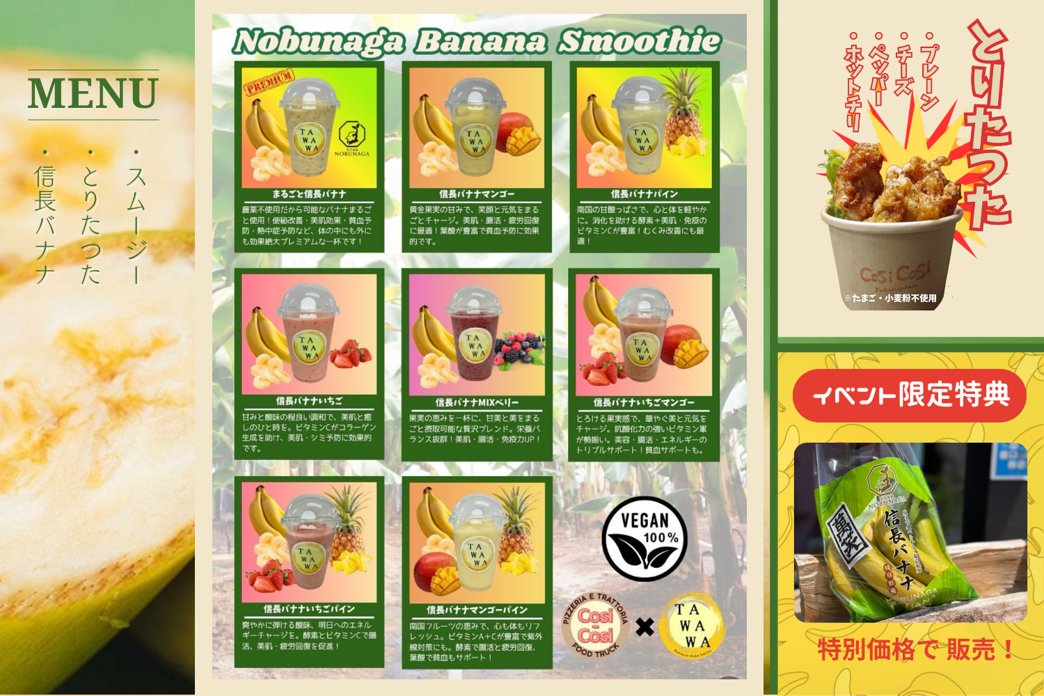 キッチンカーでは、農薬・化学肥料不使用で皮まで食べられる「信長バナナ」を使用したスムージー(全8種類)を販売。さらに、グルテンフリーの「とりたつた」や、当日限定価格での「信長バナナ」の販売も行います。