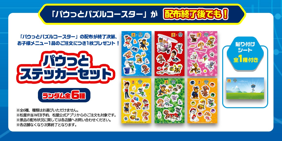 「パウっとパズルコースター」の配布が終了次第、対象メニュー1品のご注文で、「パウっとステッカーセット」を1枚プレゼントします。